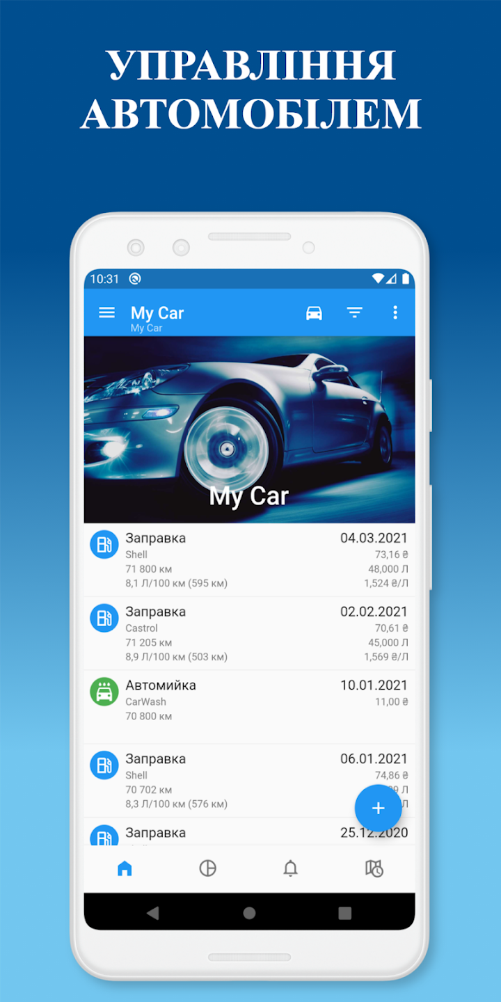 My Car - найкращий додаток для керування інформацією про Ваш автомобіль. Відстежуйте витрати на Ваш автомобіль, витрату палива, додавайте нотатки, нагадування, фотографії та інше. Дивіться і аналізуйте цікаву для вас статистику та графіки різних даних про ваш автомобіль.