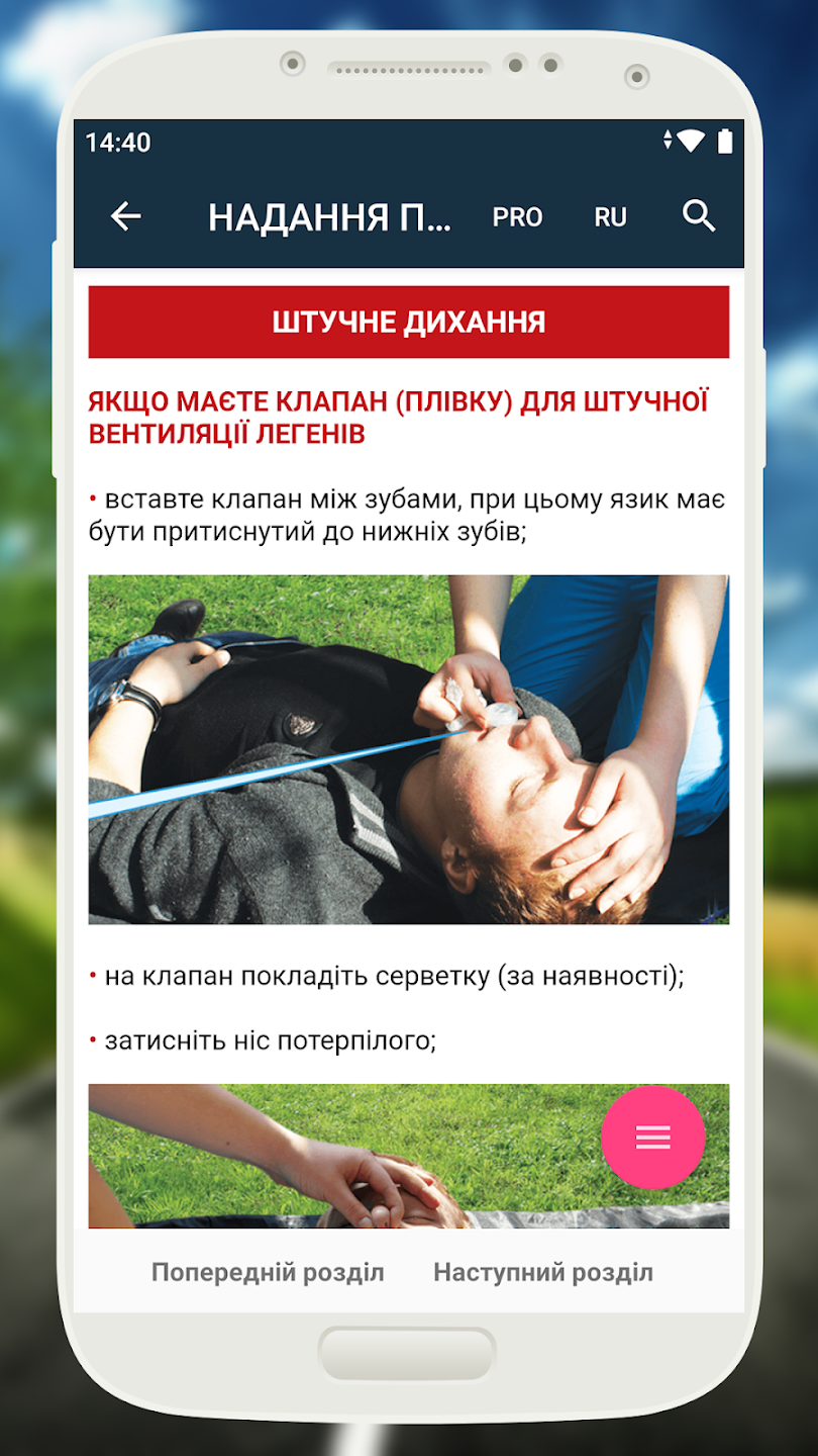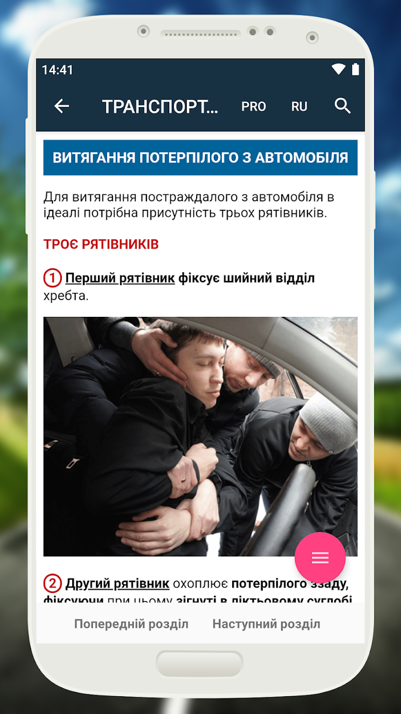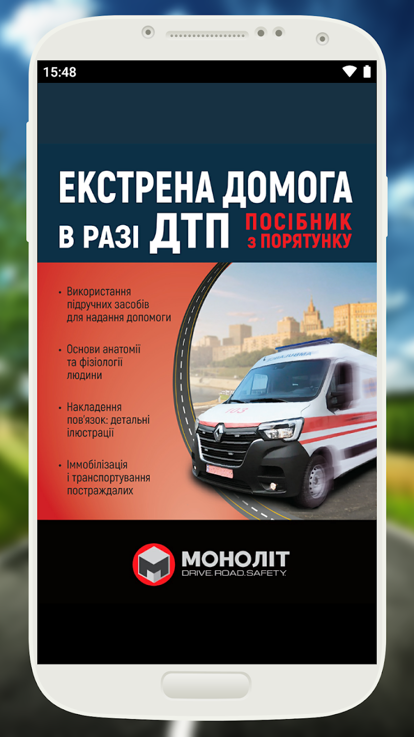 У посібнику чітко сформульовані алгоритми надання долікарської медичної допомоги при ДТП, дано докладні ілюстрації та схеми, щоб допомогти зорієнтуватися в ситуації, коли складно зосередитися та прийняти рішення. Додаток також містить рекомендації з таких актуальних питань, як боротьба зі втомою за кермом та надання допомоги при різних подіях: тепловому ударі, отруєнні, укусах комах і т.д. в повсякденному житті.