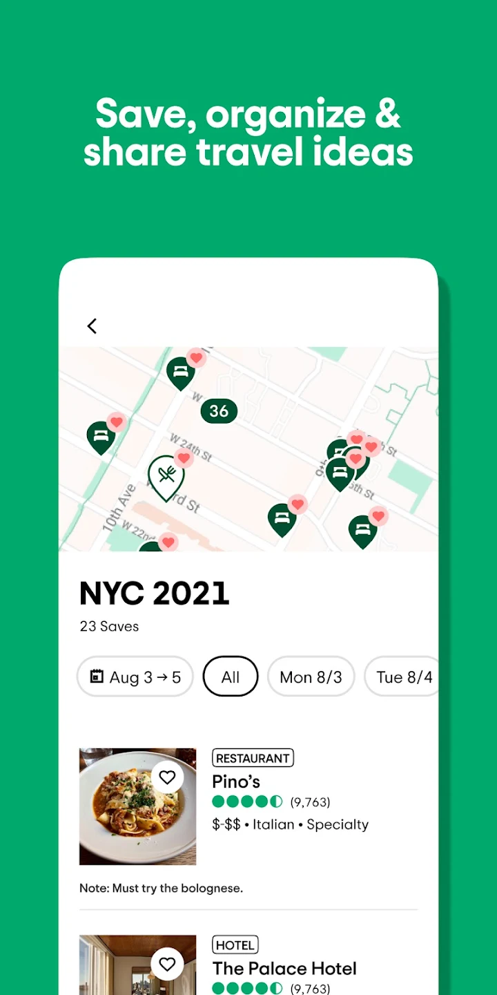 Використовуйте "Поїздки" - наш інструмент планування - дл я організації ідей та збереження сподобалися місць, які рекомендують мандрівники Збережені об'єкти можна переглядати в додатку, а також ділитися ними з супутниками та запрошувати супутників до створення спільних поїздок.