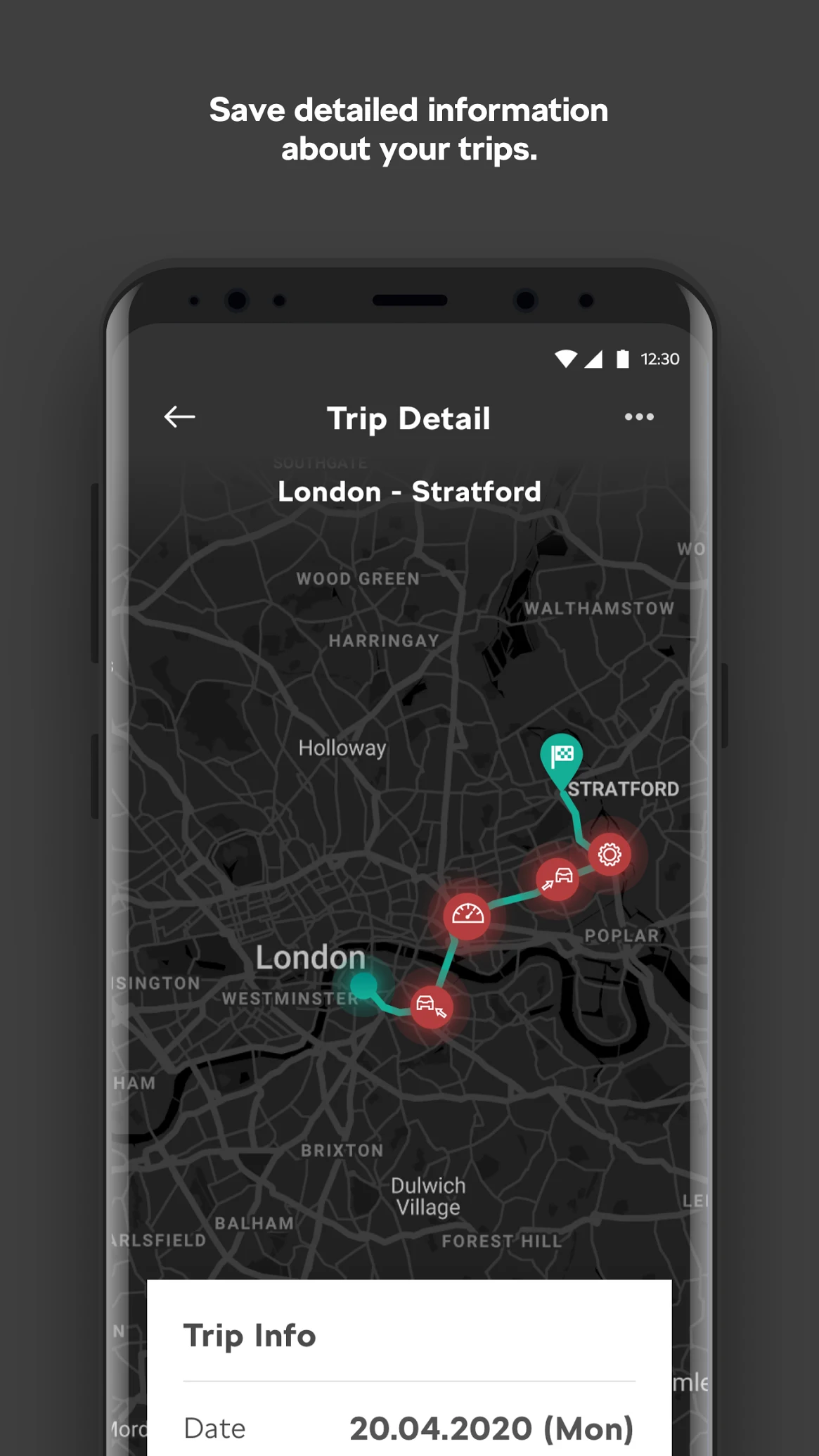 - Запускати журнал і легко записувати докладну інформацію про хід поїздки, зберігати дані про тип подорожі, його маршрут, дату, тривалість, зупинки, максимальну швидкість і кількість обертів двигуна за хвилину. Ви також можете додати фотографії з поїздки, наприклад, знімки чеків за паливо або інші корисні зображення.