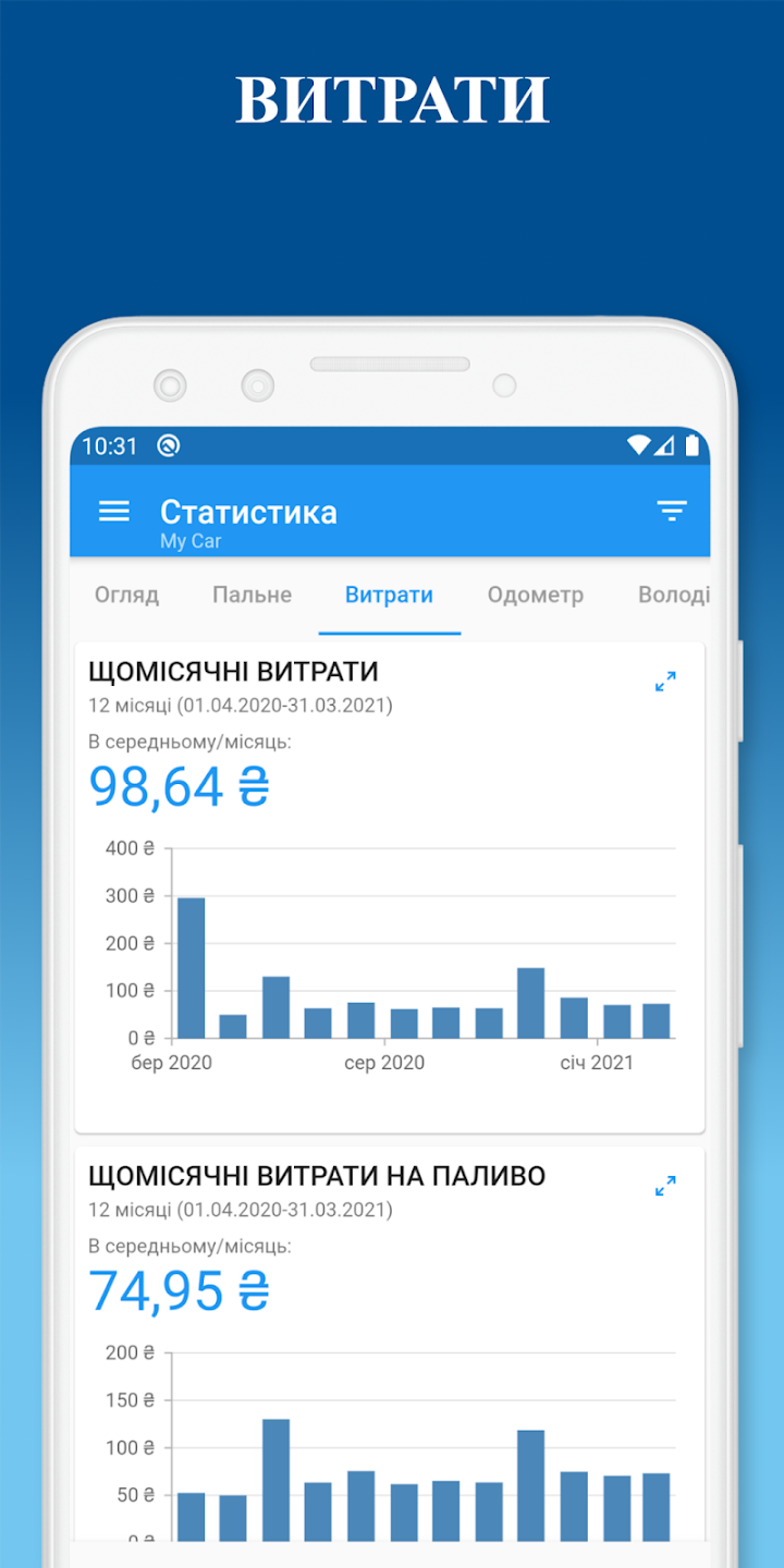 - Перегляд графіків: економія палива, пробіг, вартість палива, структура витрат, щомісячні витрати, щомісячні витрати на паливо, витрати на відрізок відстані, щоденна вартість володіння, загальні витрати.