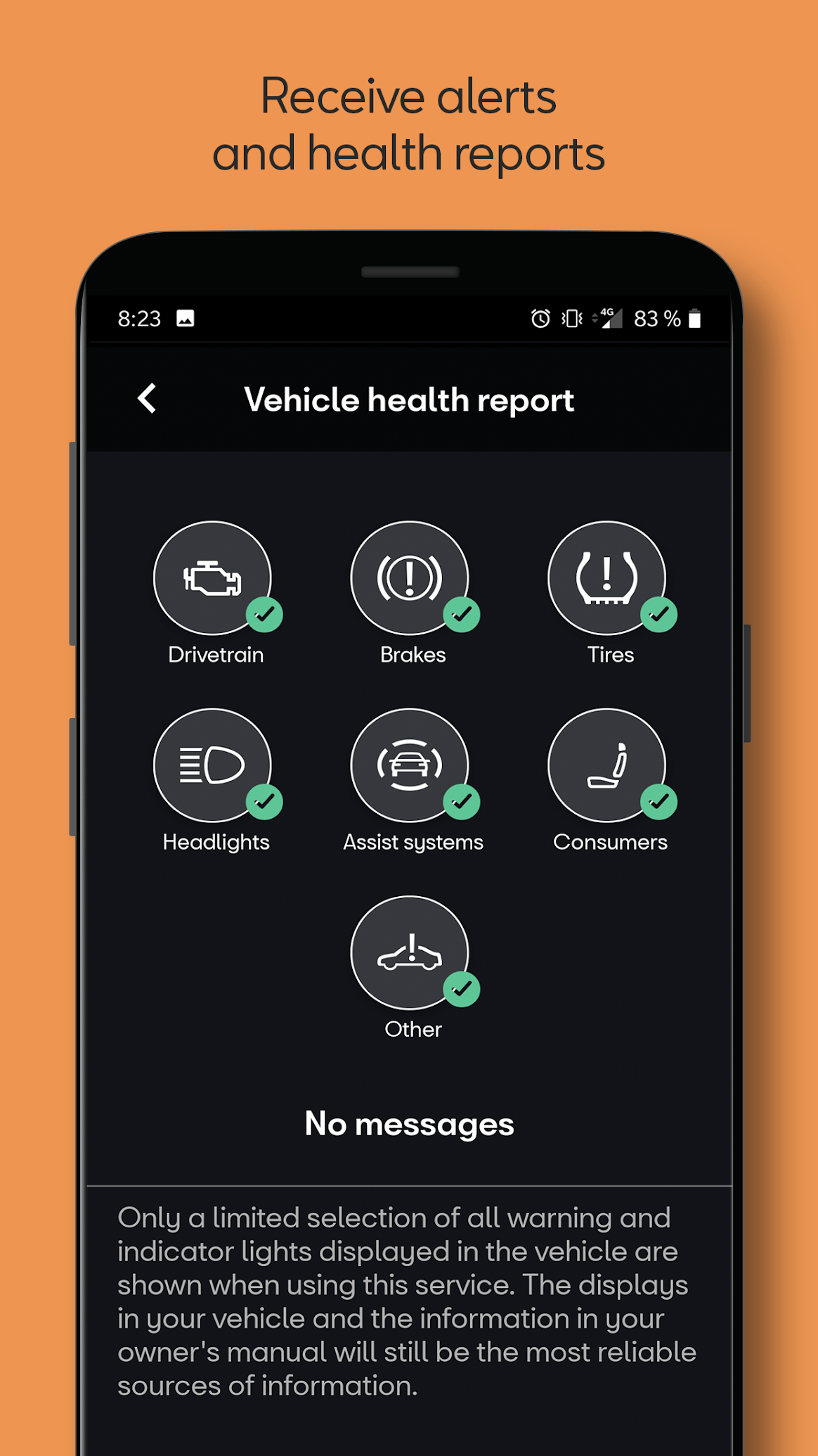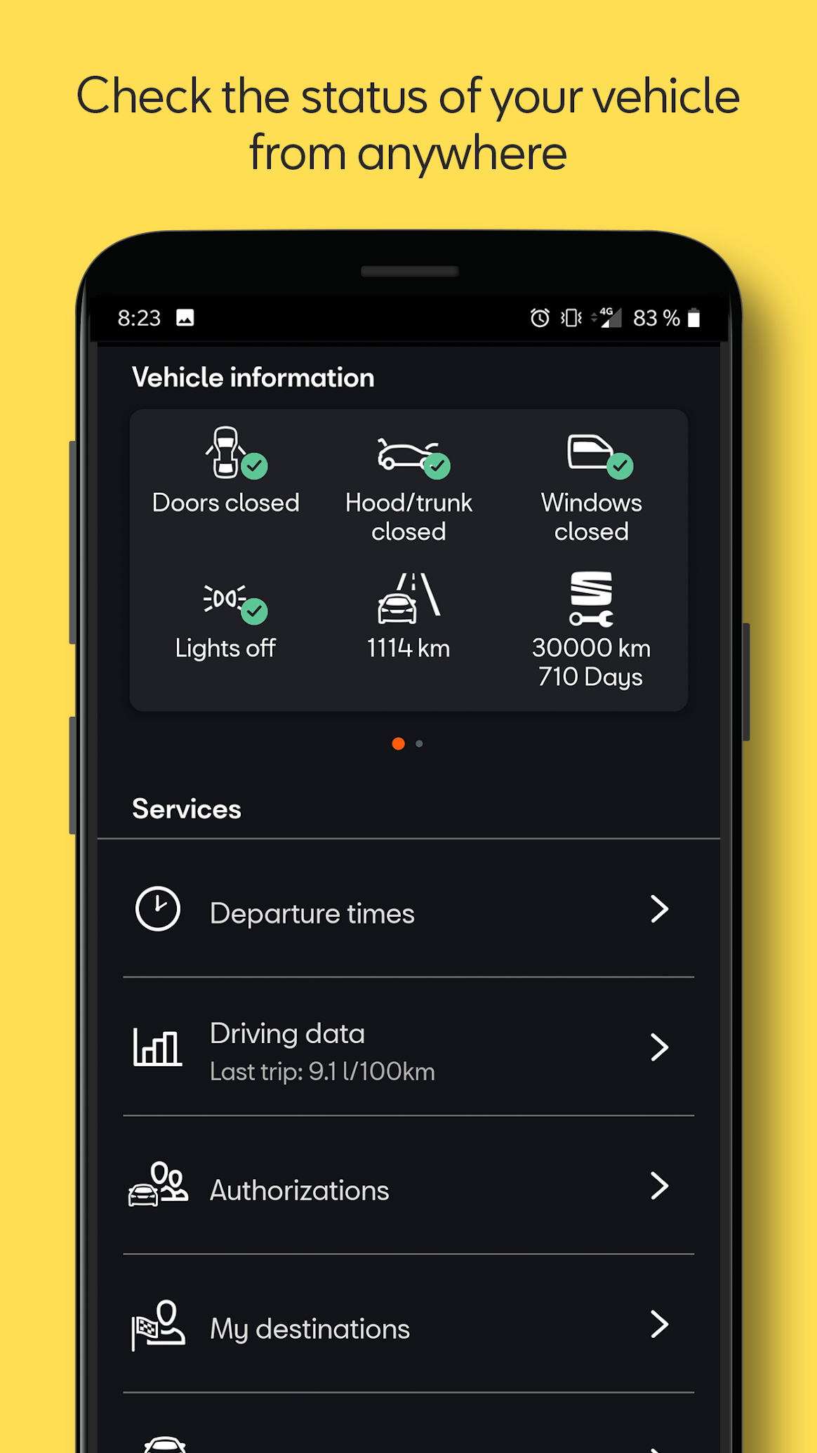 - Стан автомобіля: віддалено перевіряйте стан дверей, вікон та освітлення вашого автомобіля, а також перевіряйте час та пробіг до наступного обслуговування. Усі зі свого смартфона.