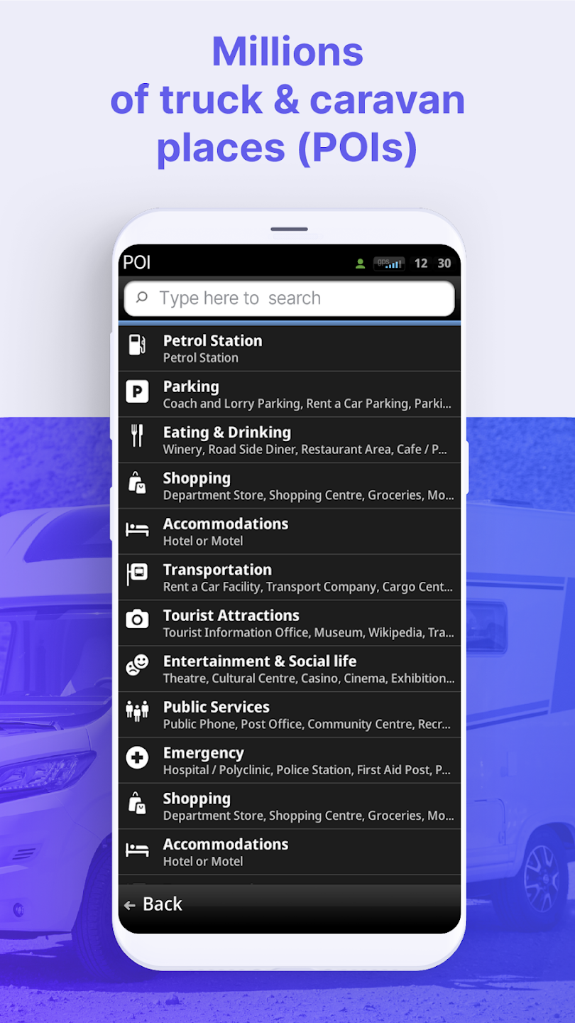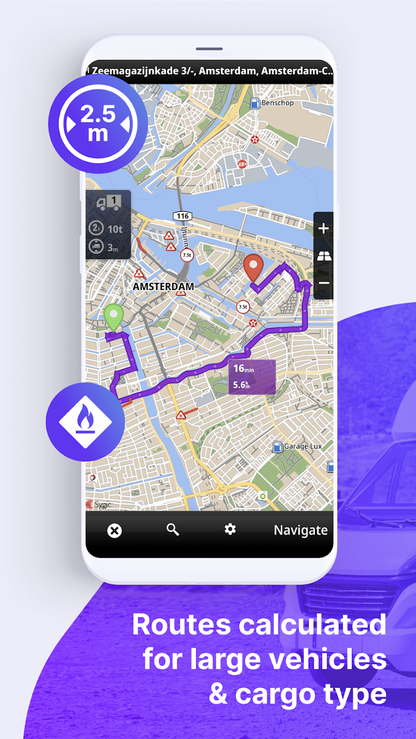 Високоякісна GPS-навігація для професійних водіїв та великогабаритного транспорту. Система навігації, якій довіряють 3 мільйони водіїв вантажівок, великовантажних транспортних засобів, фургонів, трейлерів, будинків на колесах, житлових автофургонів, автобусів та легкових автомобілів, а також безліч автопарків у всьому світі. Багато інтелектуальних функцій, якісно промальовані автономні 3D-карти та зрозумілий інтерфейс забезпечують зручну та ефективну навігацію. Sygic Truck GPS Navigation - найкращий штурман для ваших поїздок!