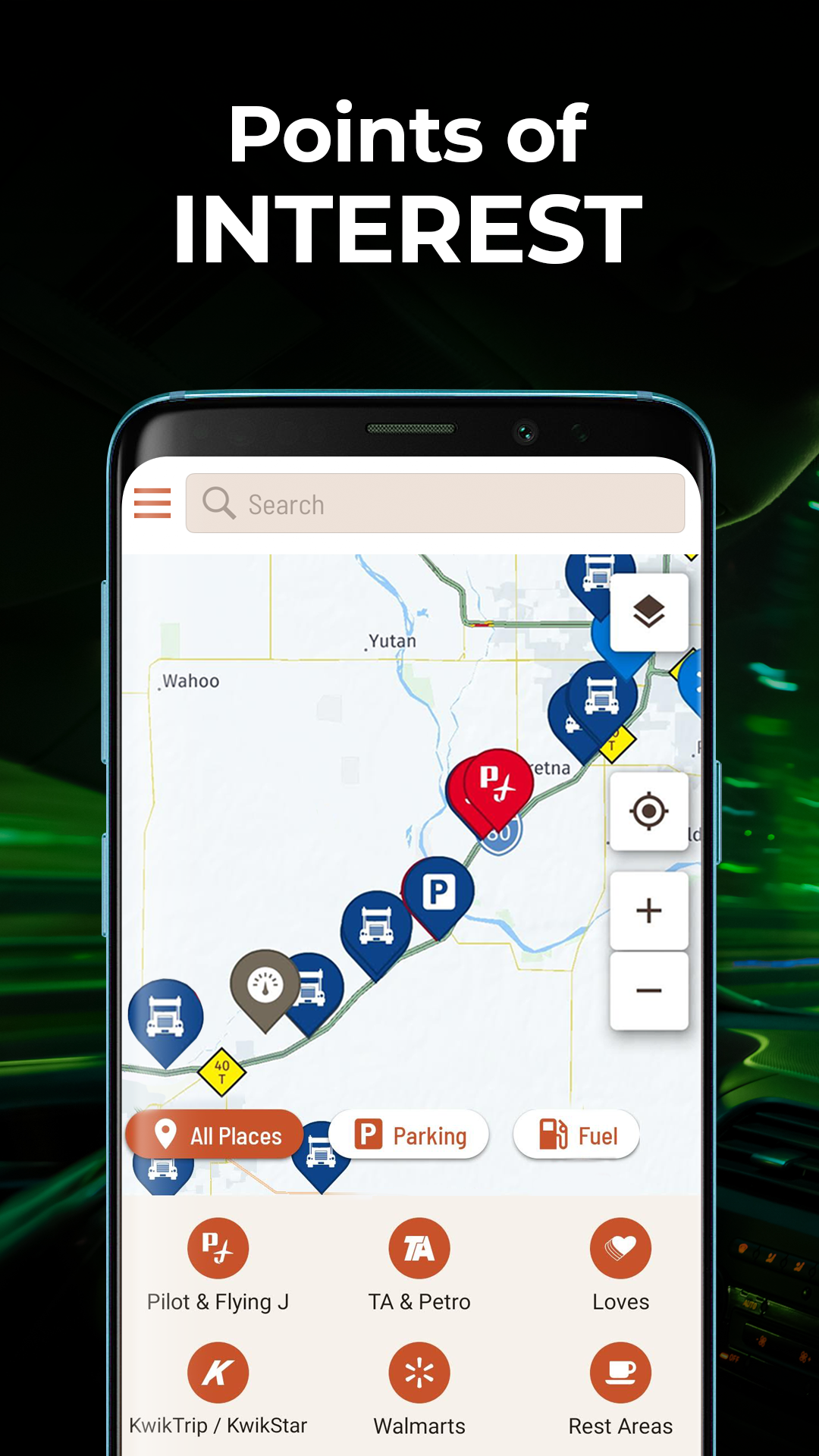 - Легко переглядайте різні місця, такі як вагові станції, стоянки для вантажівок, зони відпочинку, паркувальні та заправні станції, технічне обслуговування та багато іншого на вашому маршруті