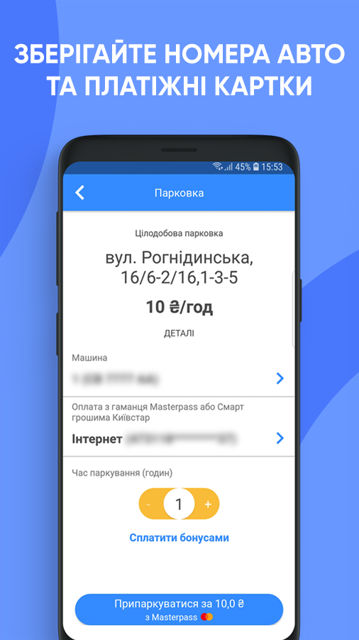 Parking UA - мобільний додаток для безготівкової оплати паркування, створений на базі цифрового гаманця Masterpass. Завдяки йому, лише раз додавши банківську картку, ви можете оплачувати паркування у два кліки. Необхідно лише обрати картку та номер авто.