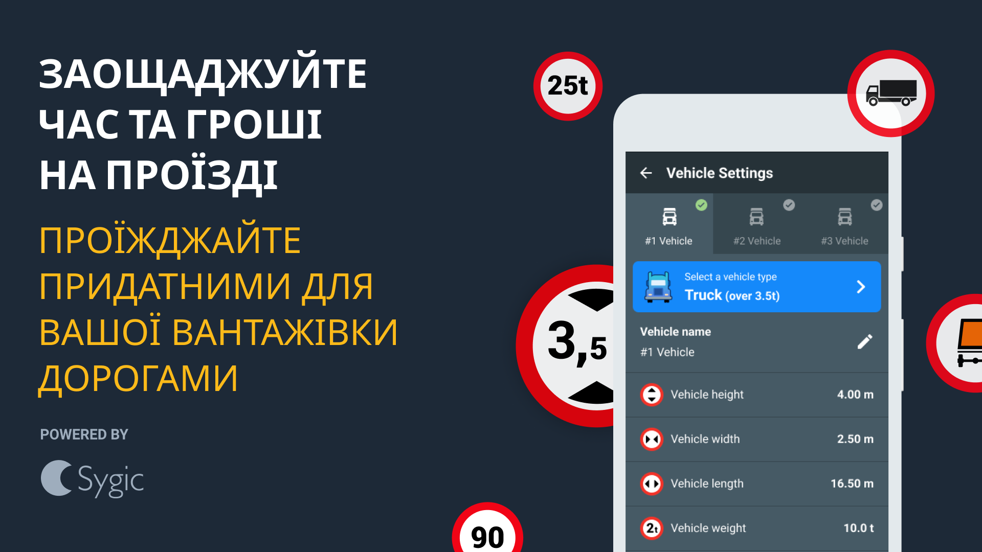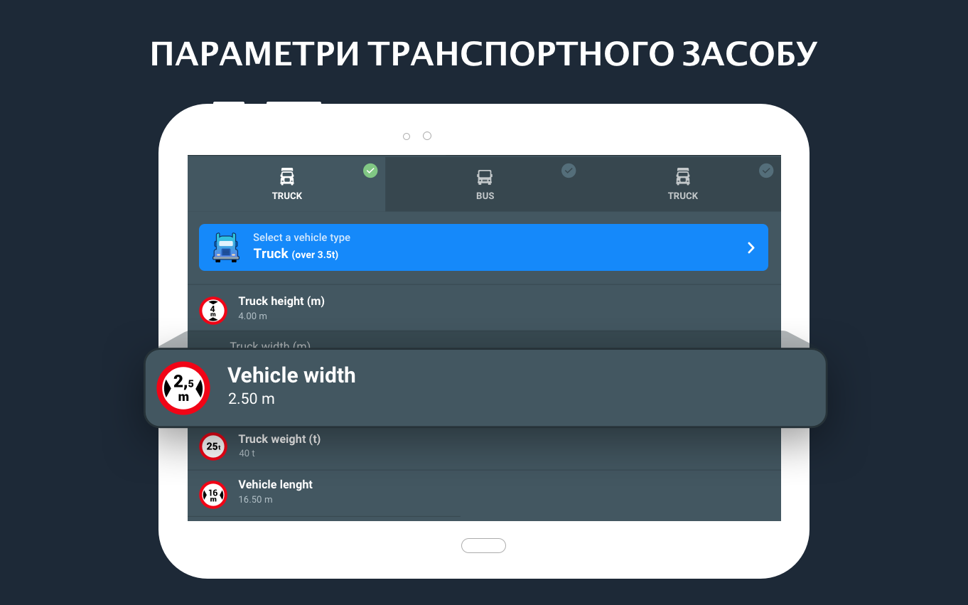 - Введіть висоту/вага/довжину/кількість осей та інші відомості, налаштуйте до 3-х профілів вантажних автомобілів, створюйте індивідуальні профілі прокладання маршрутів для різних транспортних засобів і уникайте доріг, що не підходять для вашого автомобіля та вантажу, що перевозиться
