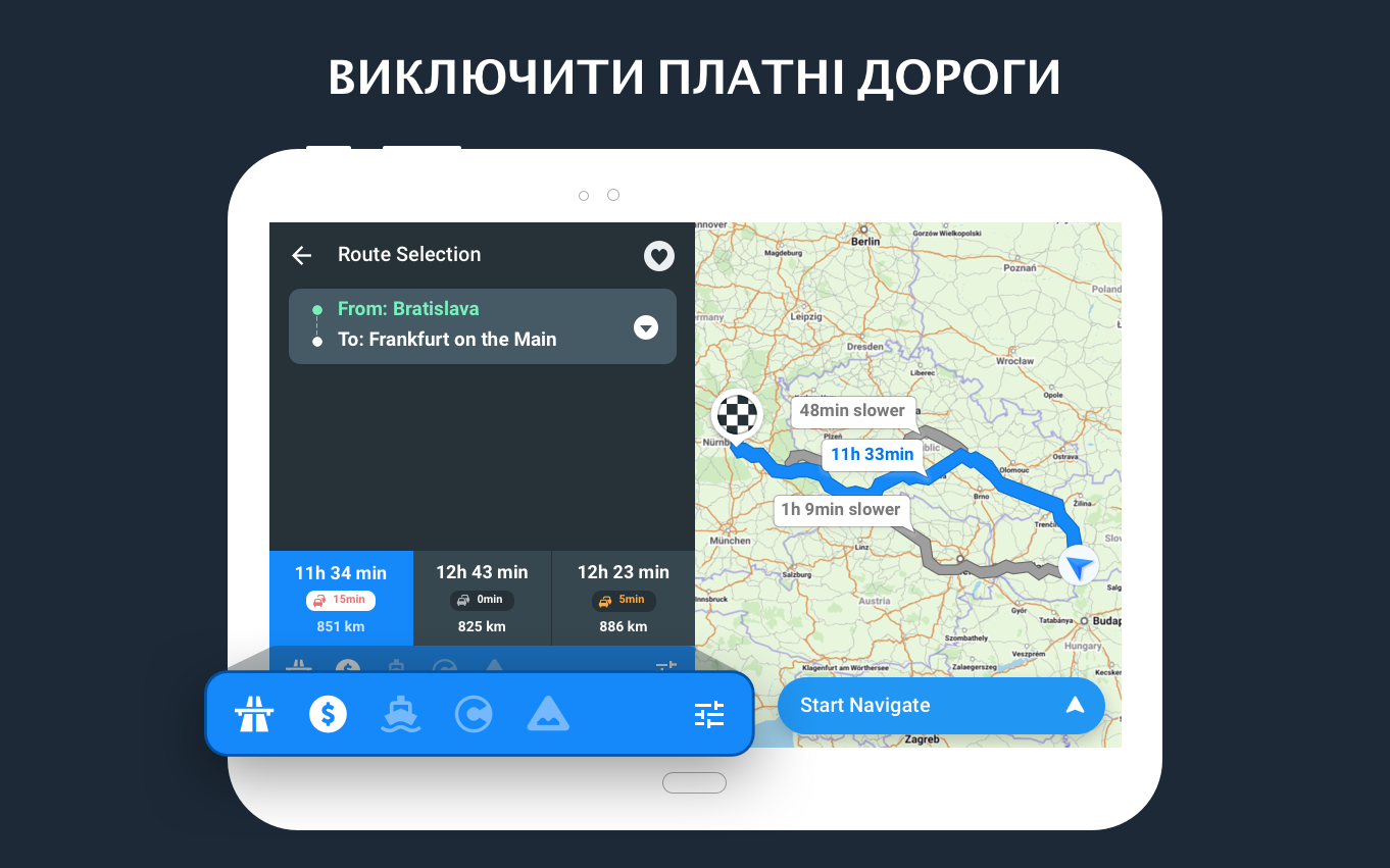 - Складіть найкращий маршрут, уникаючи руху по платних дорогах та виключаючи окремі країни