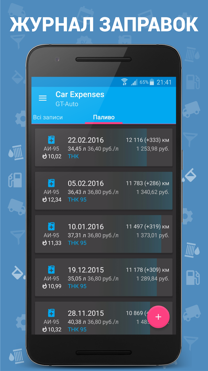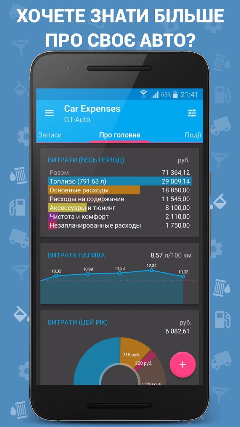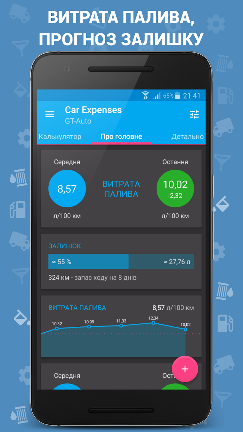 Car Expenses порахує все - витрати на паливо (газ + бензин), на утримання (страховки, паркування), на обслуговування (ТО, розхідники) і не забуде нагадати про регулярні платежі або про швидку заміну олії.
