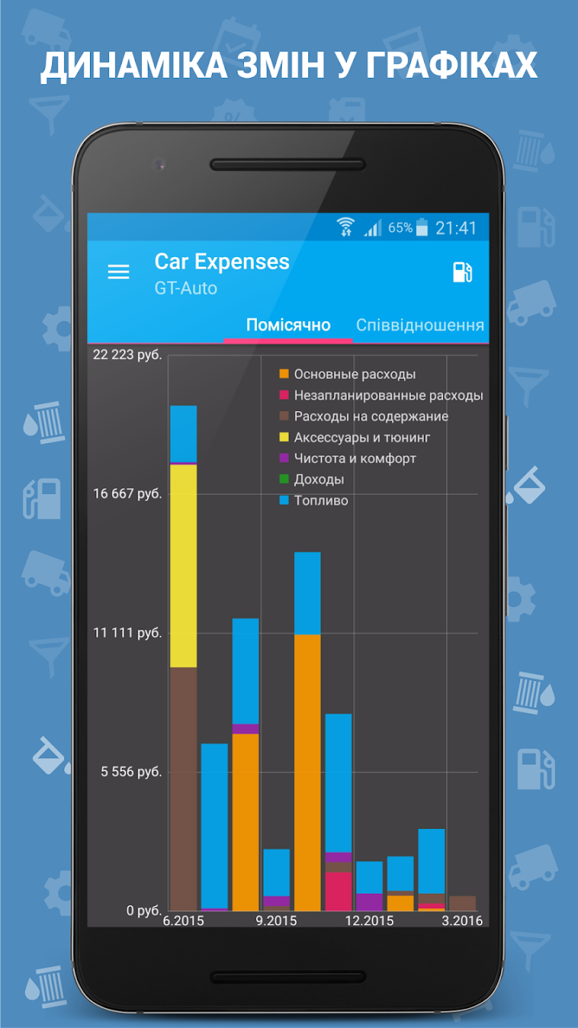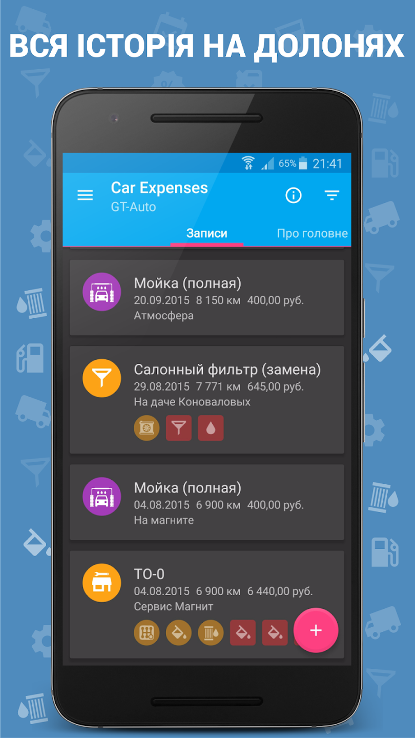 У додатку можна окремо вести облік за великою кількістю категорій витрат, стежити за тим, коли і які розхідники змінювалися плюс налаштовувати нагадування щодо їх періодичної заміни, що дуже зручно.