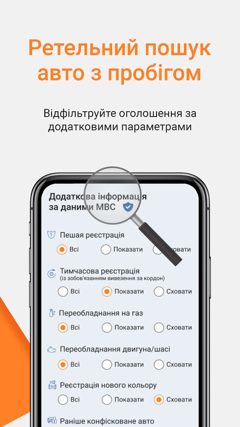 На електронному автобазарі легко знайти потрібний транспорт за допомогою фільтрів. Вкажіть параметри, що вас цікавлять: модель, рік випуску, пробіг, об'єм двигуна та іншу важливу інформацію – додаток сам підбере відповідні варіанти.