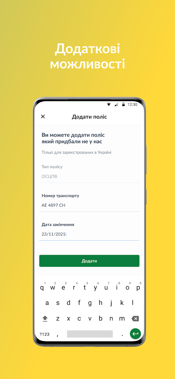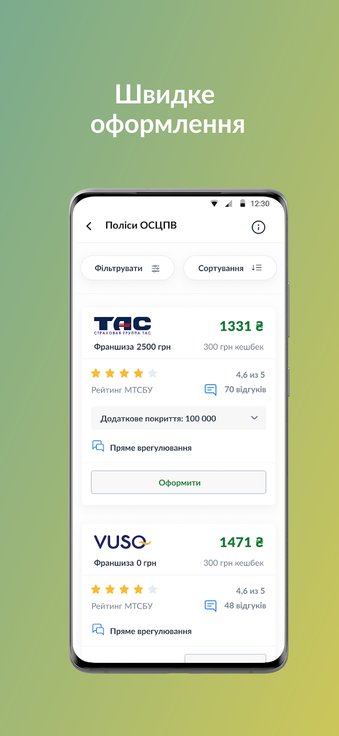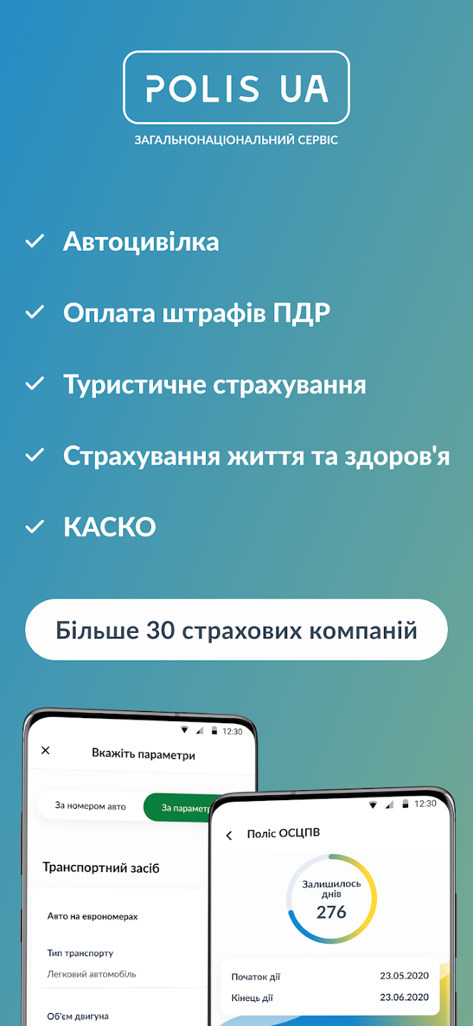 У додатку Ви можете розрахувати, вибрати і оформити менш ніж за 2 хвилини потрібну страховку для вашого автомобіля. Додаток підбирає найвигідніші пропозиції від популярних українських страхових компаній. Ви можете придбати обов'язкове страхування відповідальності автовласників (автоцивілка). Автостраховка діє цілий рік, до моменту її переоформлення. Підсилюйте свій фінансовий захист полісом додаткового покриття на випадок аварії або травми в результаті ДТП.