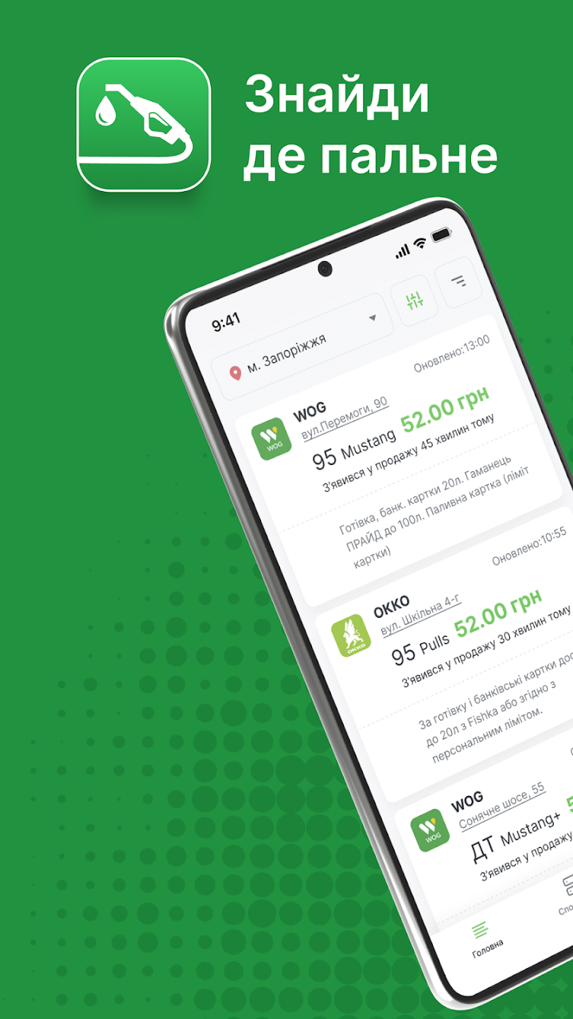Додаток містить інформацію про найближчі, або у обраному Вами місті, АЗС та надає інформацію про наявність та вартість палива на них. Мережі АЗС: УКРНАФТА, ANP, OKKO, WOG, АВІАС ПЛЮС, БРСМ, АВІАС, UPG, Socar, МАВЕКС, ЮКОН Сервіс, Sentosa Oіl, ЮКОН, ЗНП, Rubіx, Петрол Гарант, МАВЕКС плюс, ЕЛІН, УКРТАТНАФТА