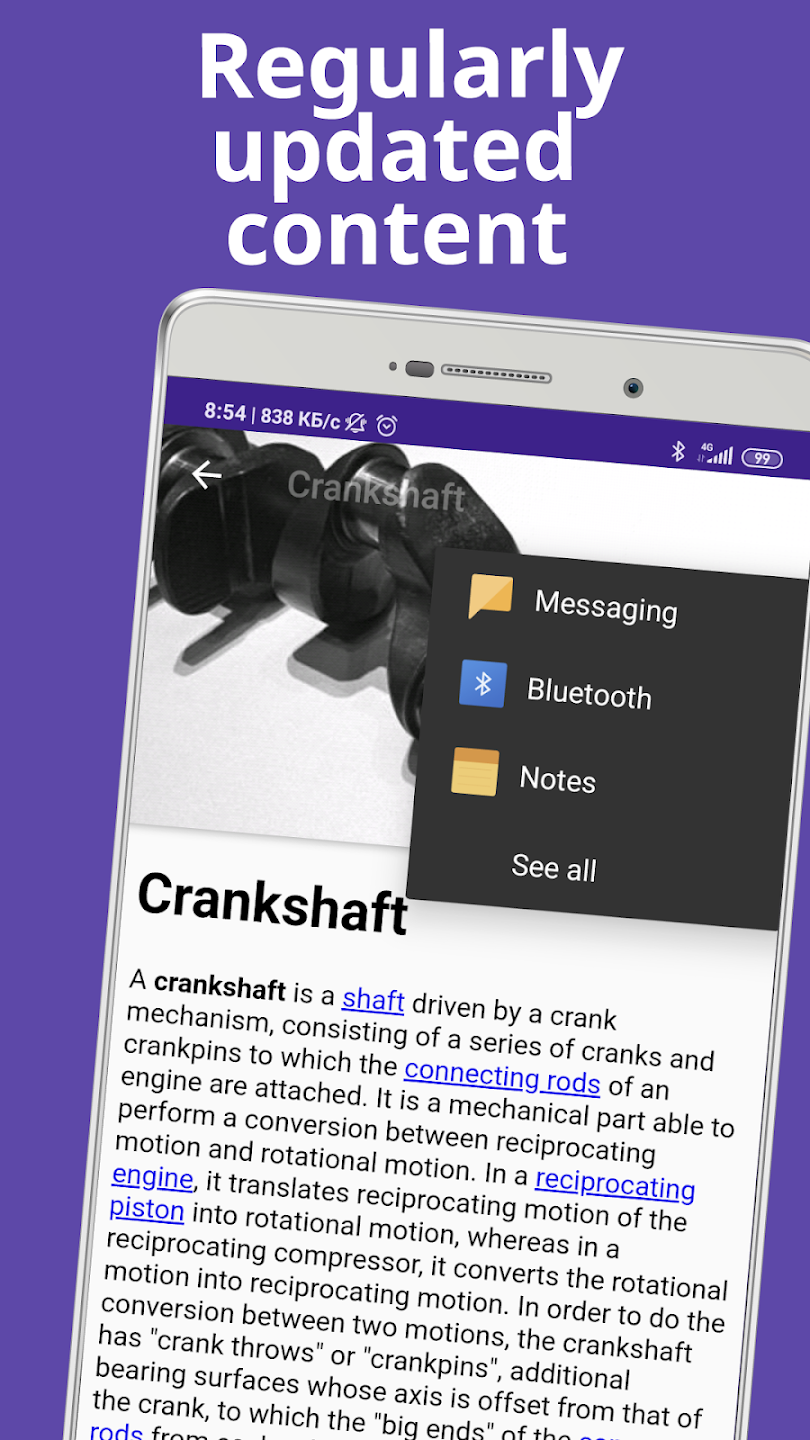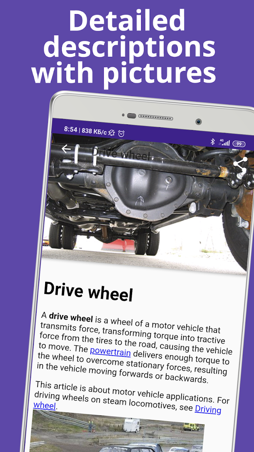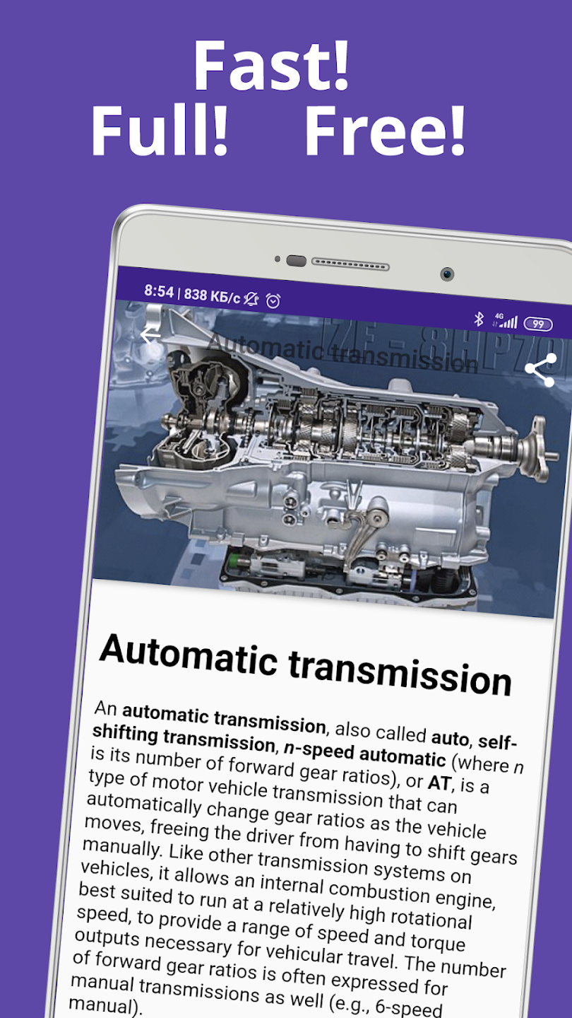 Застосунок допоможе вам дізнатись, як працює ваш автомобіль. Не кожен, навіть досвідчений автолюбитель знає, як працює сучасний автомобіль, а якщо ви новачок, то вам ще обов'язково доведеться зіткнутися з питаннями обслуговування, ремонту та діагностики автомобіля. І можуть виникнути такі ситуації, коли вам доведеться самостійно ремонтувати автомобіль. З цим додатком ви зможете краще діагностувати та виправляти проблеми вашого автомобіля, як легкового, так і вантажного.