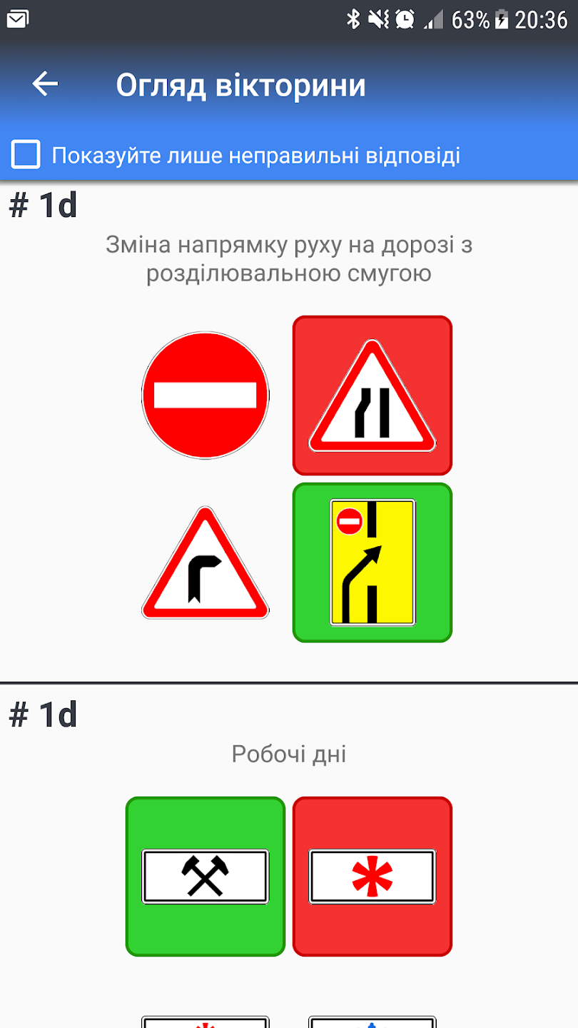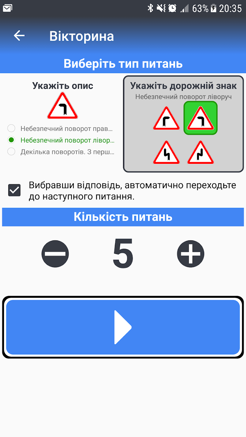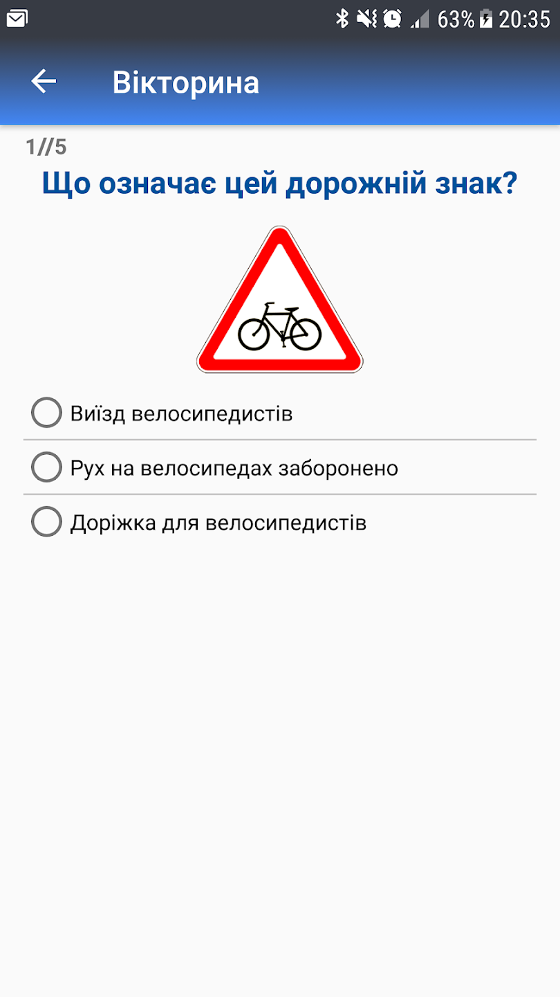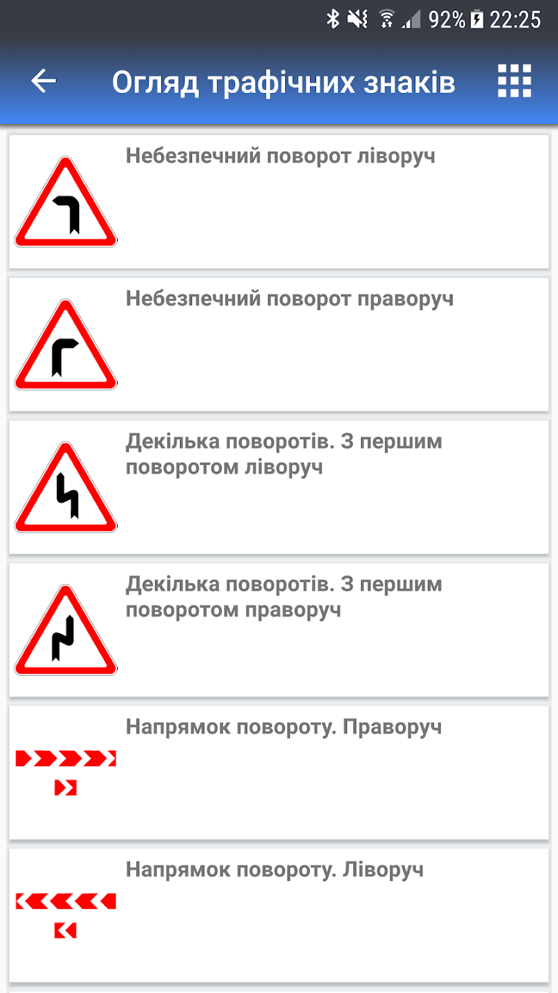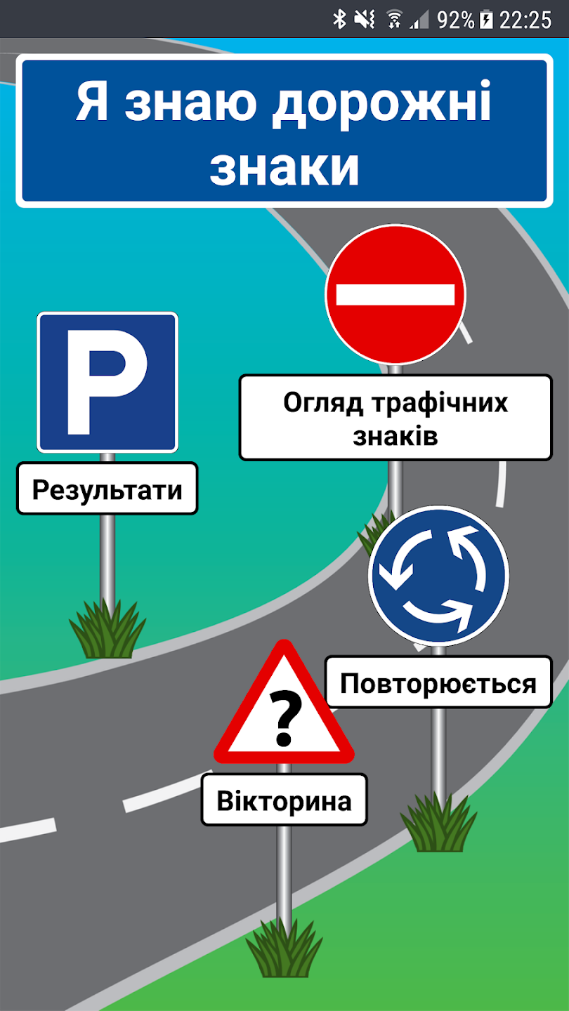 Застосунок містить перелік дорожніх знаків та їх опис. Допоможе оновити ваші знання про дорожні знаки.Результати вікторини будуть записані в таблиці, де ви зможете перевірити свої досягнення, а також переглянути кожну із виконаних вікторин.