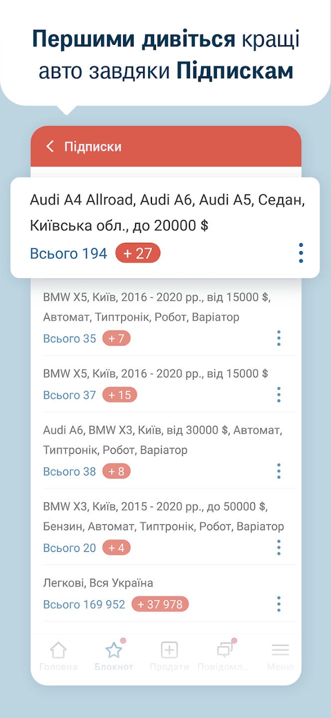 3. Миттєві повідомлення допоможуть бути в курсі всього, що стосується ваших автопродажів: перегляди ваших оголошень, коментарі до них та їх позиції в пошуку, пропозиції обміну та торгу, повідомлення про дзвінки та повідомлення в чаті.