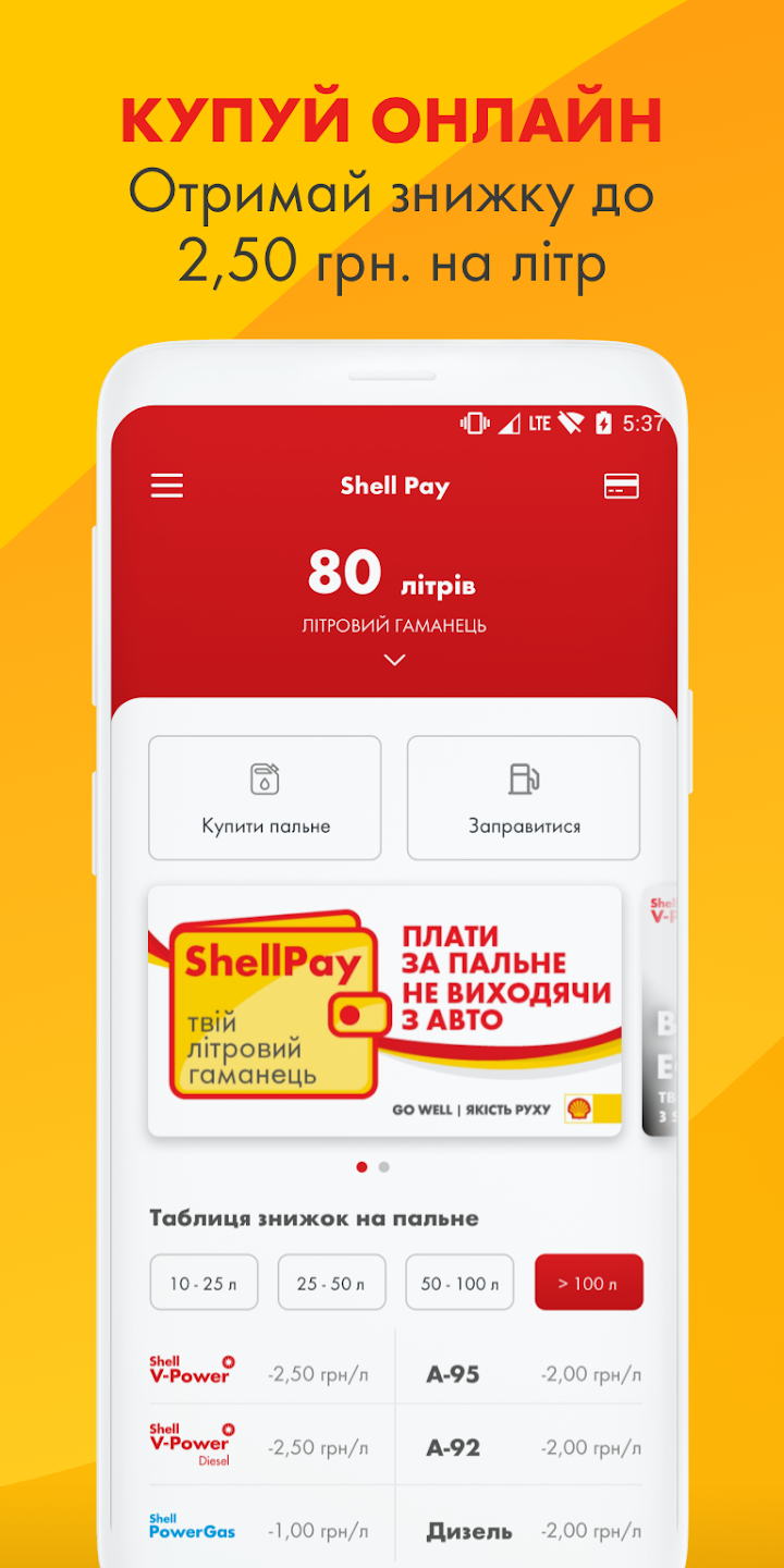 Новий додаток Shell Ukraine! Купуй пальне онлайн та отримай знижку на кожен літр! Накопичуй та витрачай бали на будь які товари на АЗС.