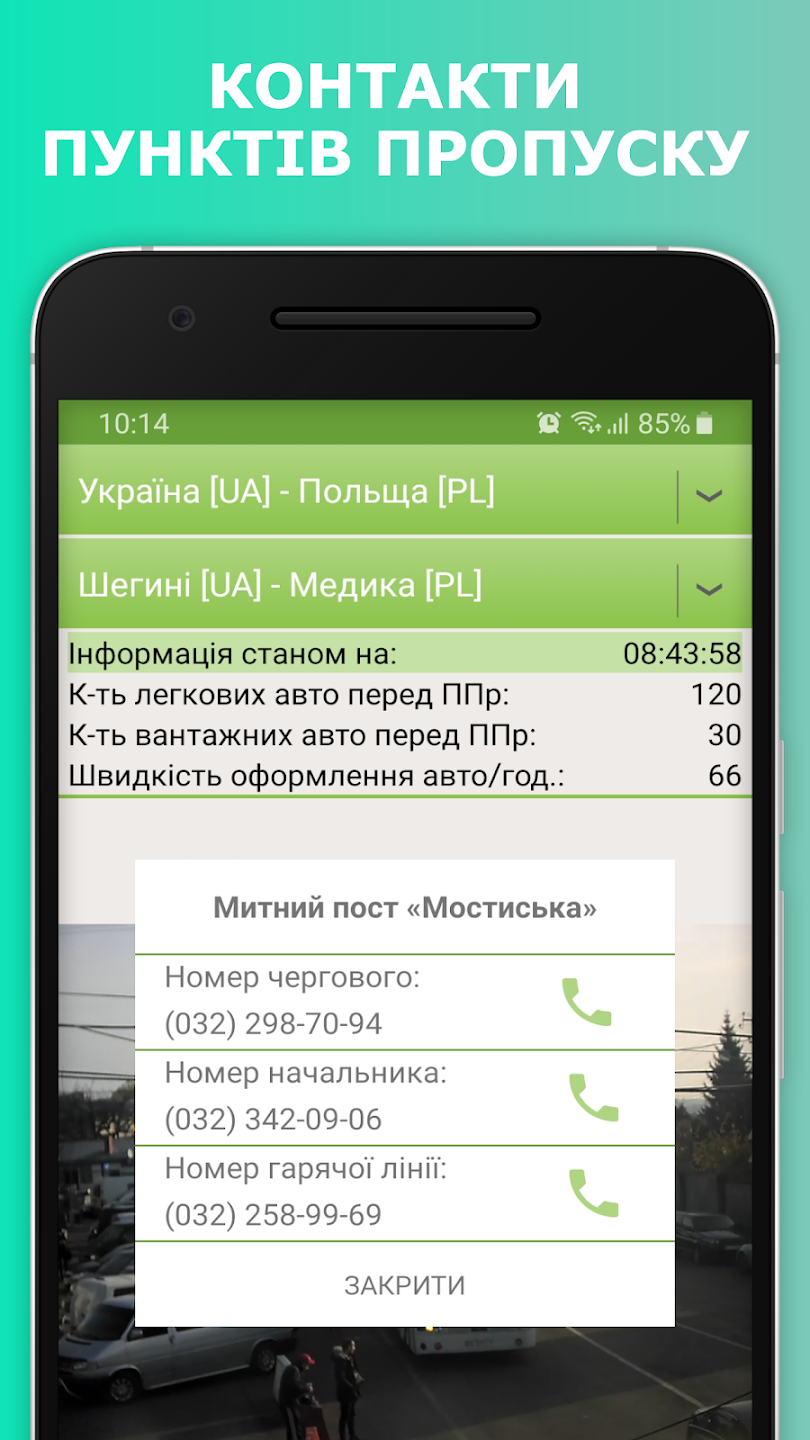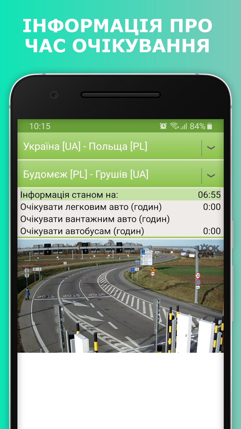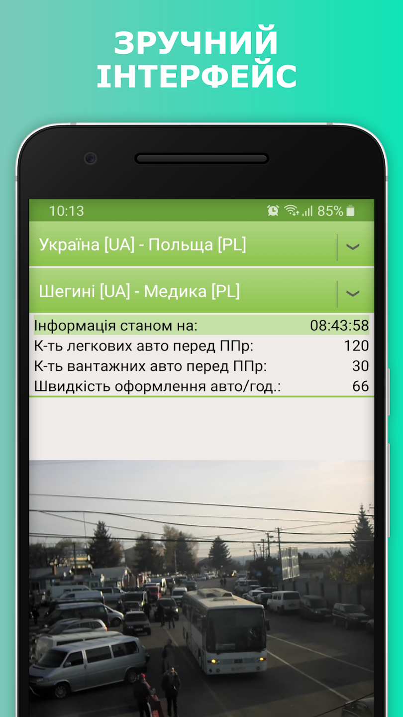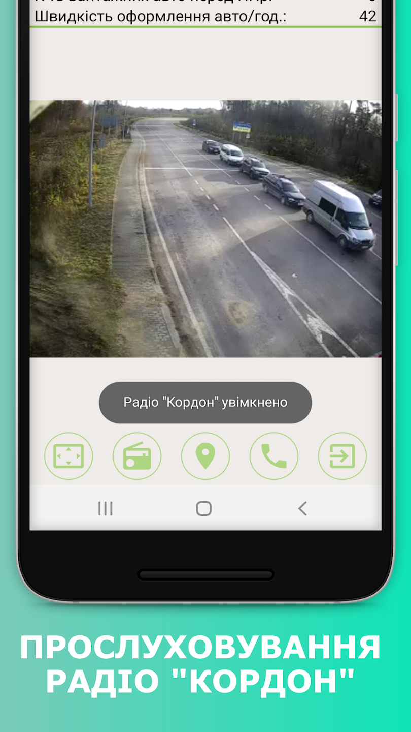 Можливість оновлення даних вибраного пункту пропуску свайпом вниз. Для перегляду відео на весь екран просто переверніть телефон в горизонтальний (пейзажний) режим або натисніть на відповідну кнопку в додатку. Камери в проміжних зонах, між двома пунктами пропуску, позначені спеціальним символом
