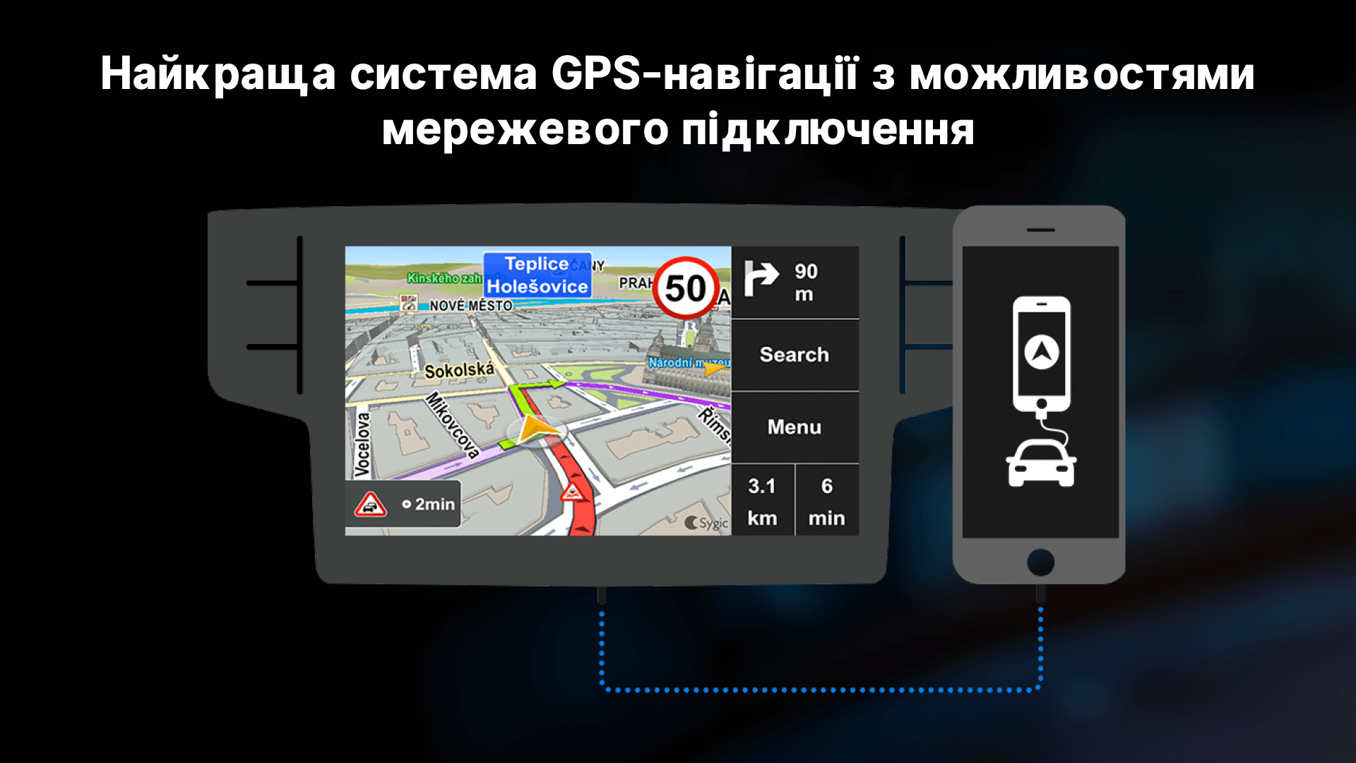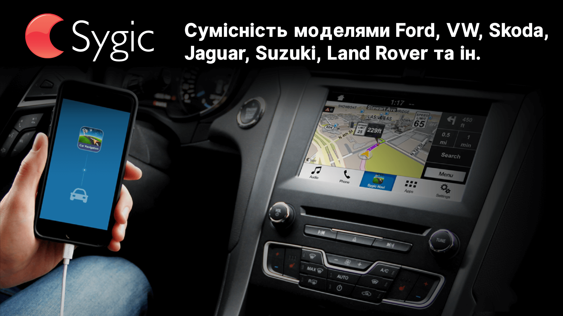 Система навігації Sygic Car - це програма, оптимізована для роботи з вбудованими автомобільними мультимедійними системами через смартфон для підключення до панелі приладів. Просто підключіть Sygic Car через USB-кабель до мультимедійної системи автомобіля. Їм можна керувати за допомогою кнопок та важелів на кермі, голосових команд або сенсорного екрану. Завдяки таким унікальним можливостям, як мережеве підключення для автомобілів, відомості про ситуацію на дорогах в реальному часі, дані про обмеження швидкості та ціни на пальне, Sygic Car набагато краща за звичайну вбудовану навігаційну систему.