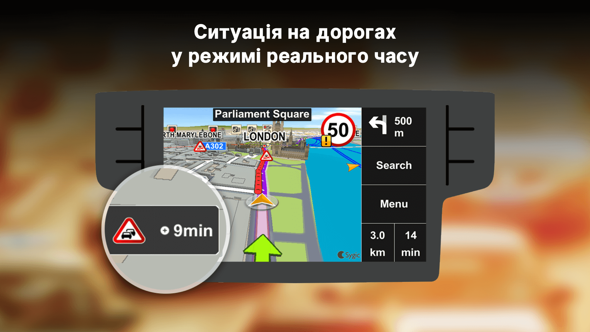 Обмеження швидкості Дуже важливо знати обмеження швидкості на тій чи іншій ділянці дороги. У Sygic Car є спідометр і дані про обмеження швидкості, тому вам завжди буде відображатися поточна та максимально допустима швидкість на трасі, якою ви їдете.