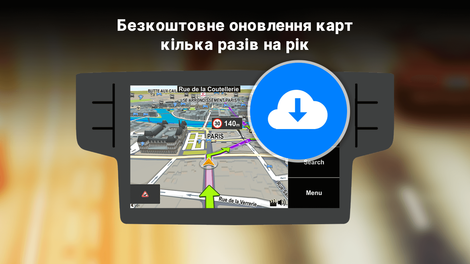 Автономні картки з безкоштовними та безстроковими оновленнями Використовуйте якісні автономні карти де і коли завгодно. Актуальні карти зберігаються безпосередньо на Smartphone, тому вам не потрібно підключатися до Інтернету. Відмінний варіант для використання за кордоном. Можливість безстрокового оновлення карток надається безкоштовно. Ви можете оновлювати карти кілька разів на рік і завжди використовувати найточніші дані.