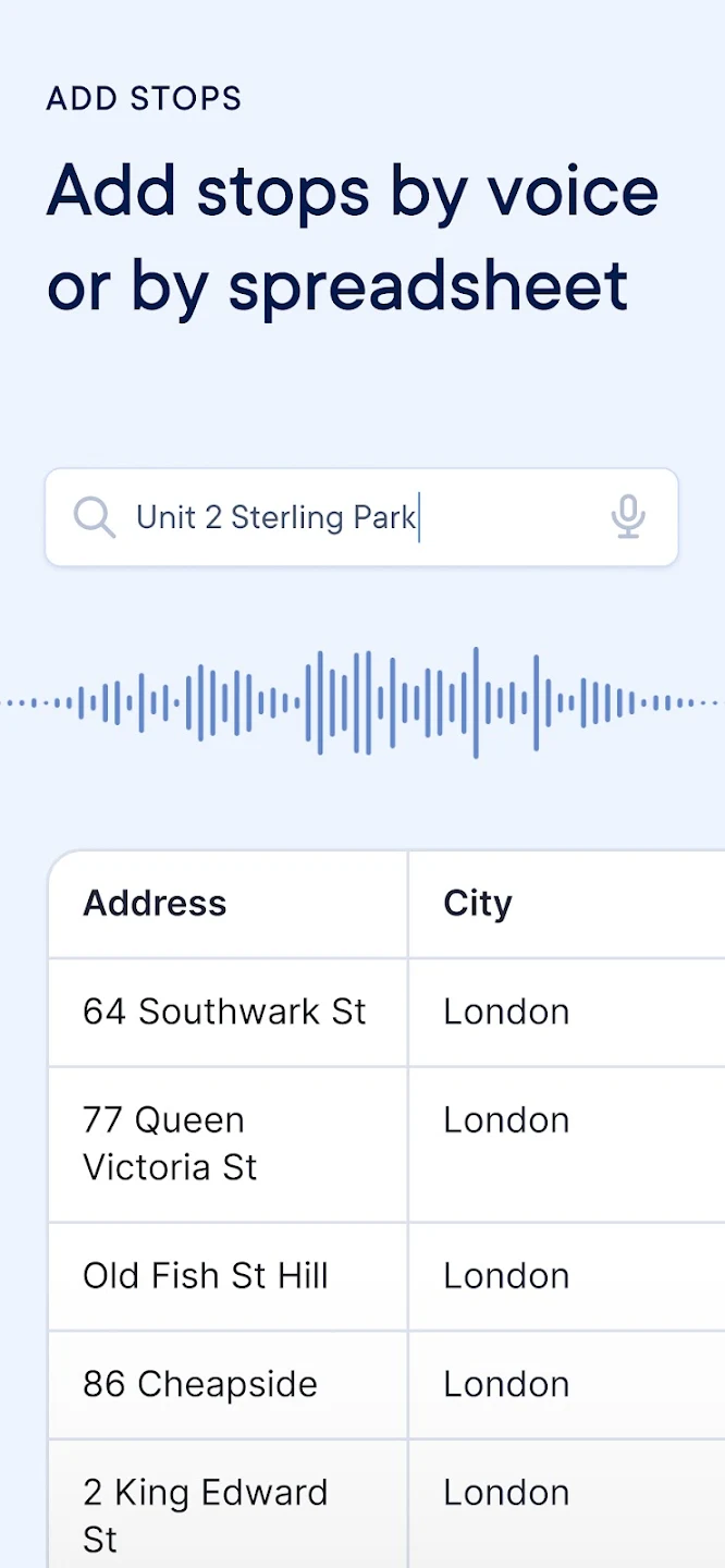 - швидко знаходьте та додавайте пункти призначення за допомогою точної адреси, поштового індексу або голосового пошуку в програмі водія