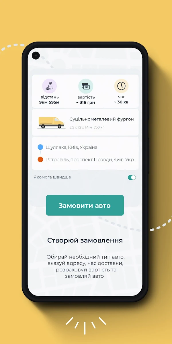 - опціонально замовити вантажне таксі терміново «на зараз» чи на потрібну дату та час