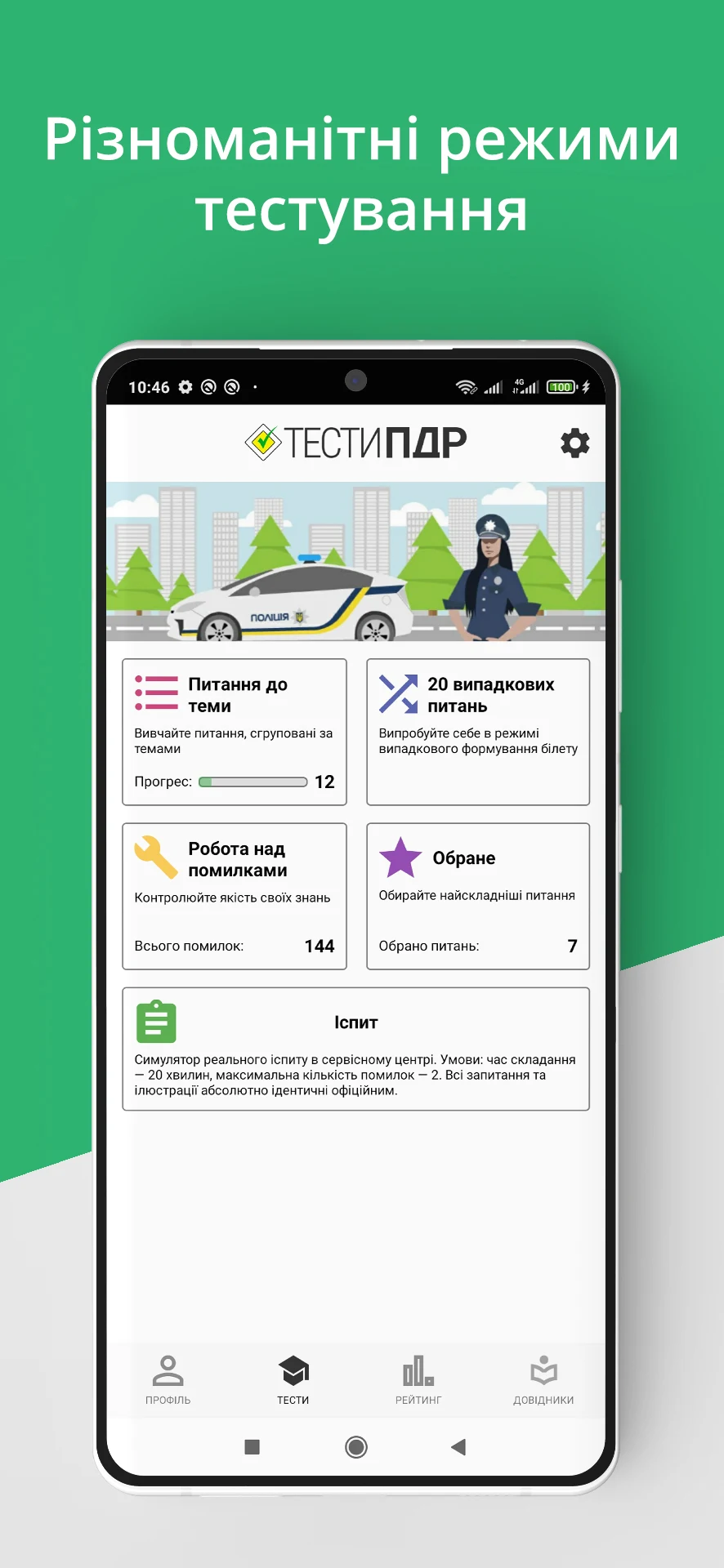 Додаток направлений на якісну підготовку майбутніх українських автомобілістів. Над запитаннями тестів не один рік працювали фахівці та викладачі провідних автошкіл України. У цих питаннях використовуються лише фотореалістичні 3D-ілюстрації, що імітують реальні ситуації на дорозі.