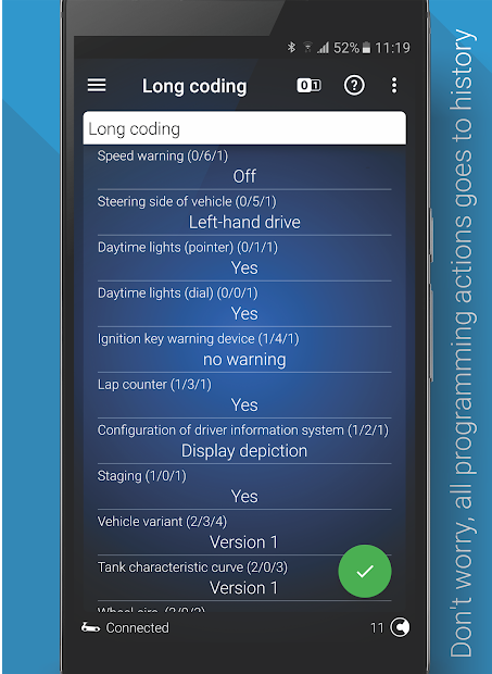 Розумійте та налаштовуйте свій автомобіль за допомогою простого у використанні програми на смартфоні або планшеті. Маленький, але потужний пристрій OBDeleven спілкується з вашим автомобілем через Bluetooth, виконуючи всі функції складного та дорогого діагностичного обладнання.