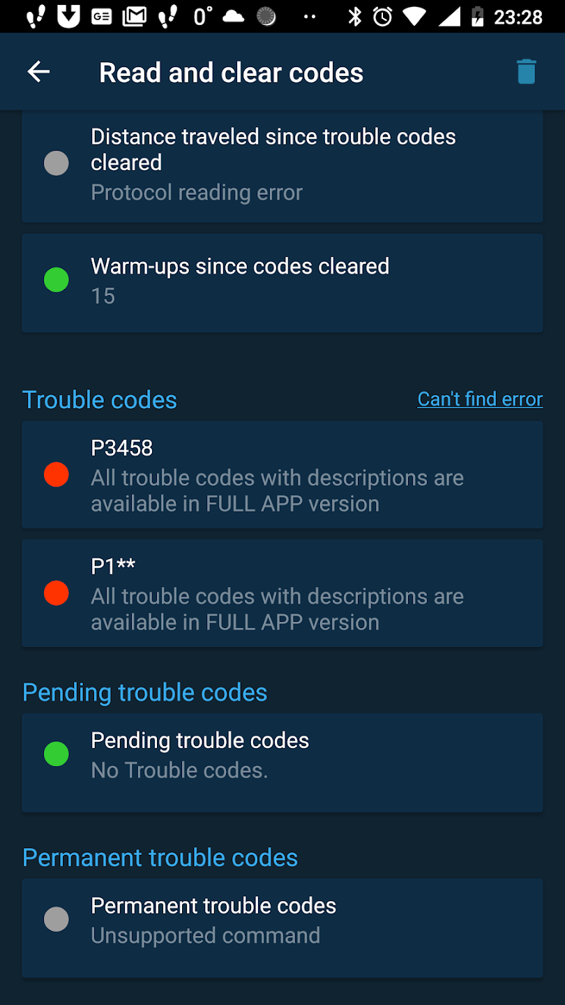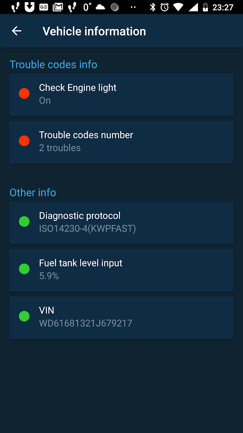 Ви можете читати та скидати діагностичні коди помилок у OBD2 сумісних модулях вашого автомобіля. Зазвичай це модулі, які відповідають за роботу двигуна і трансмісії. Ви можете бачити короткі описи кодів помилок і гуглити їх просто по кліку (доступно в повній версії) У випадку якщо в блоці управління є помилка, то можна вважати стоп-кадр інформацію (стан датчиків автомобіля в момент появи помилки). ви можете читати такі динамічні параметри автомобіля як швидкість, обороти двигуна, масова витрата повітря, температуру всмоктуваного повітря, температура антифризу (охолоджуючої рідини)