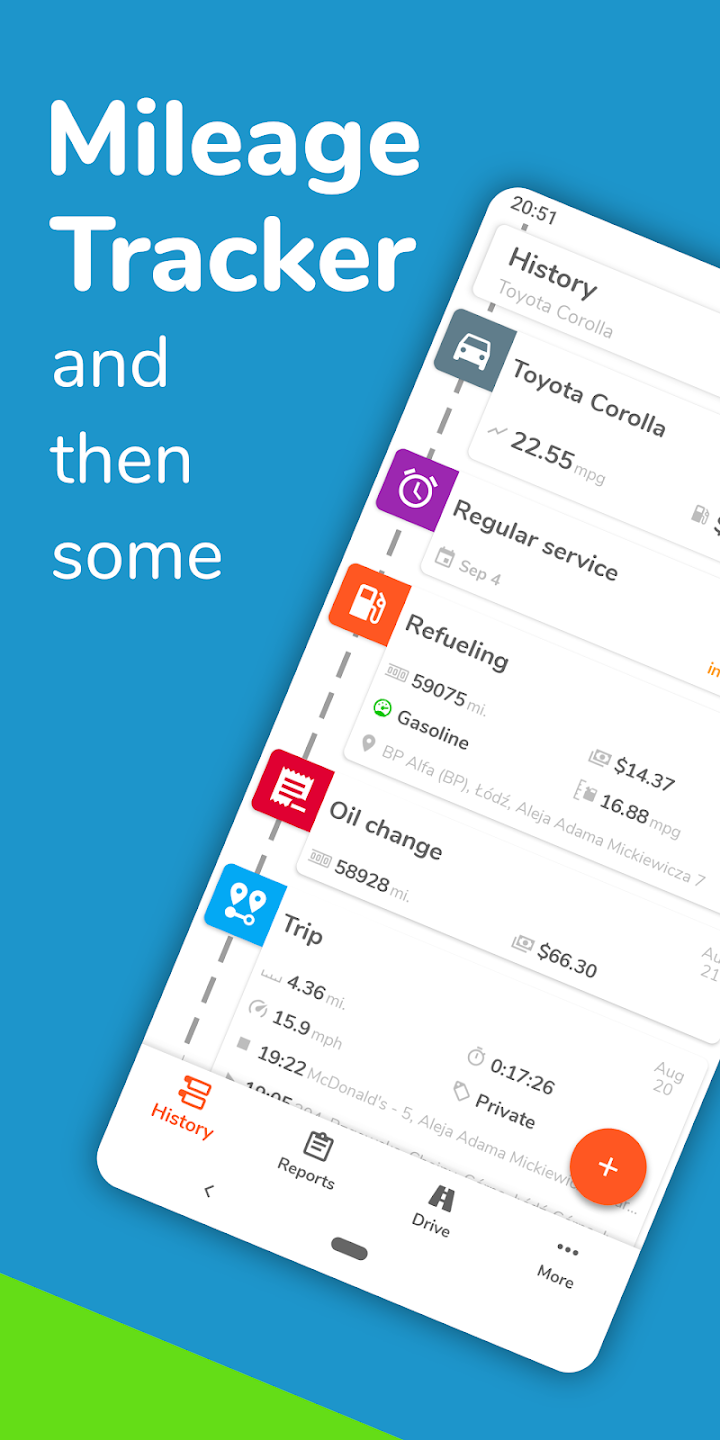 Забезпечує середню економію палива, витрату палива в місті та економію палива на трасі. Калькулятор вартості палива, журнал паливного балансу та нагадування служби включені!