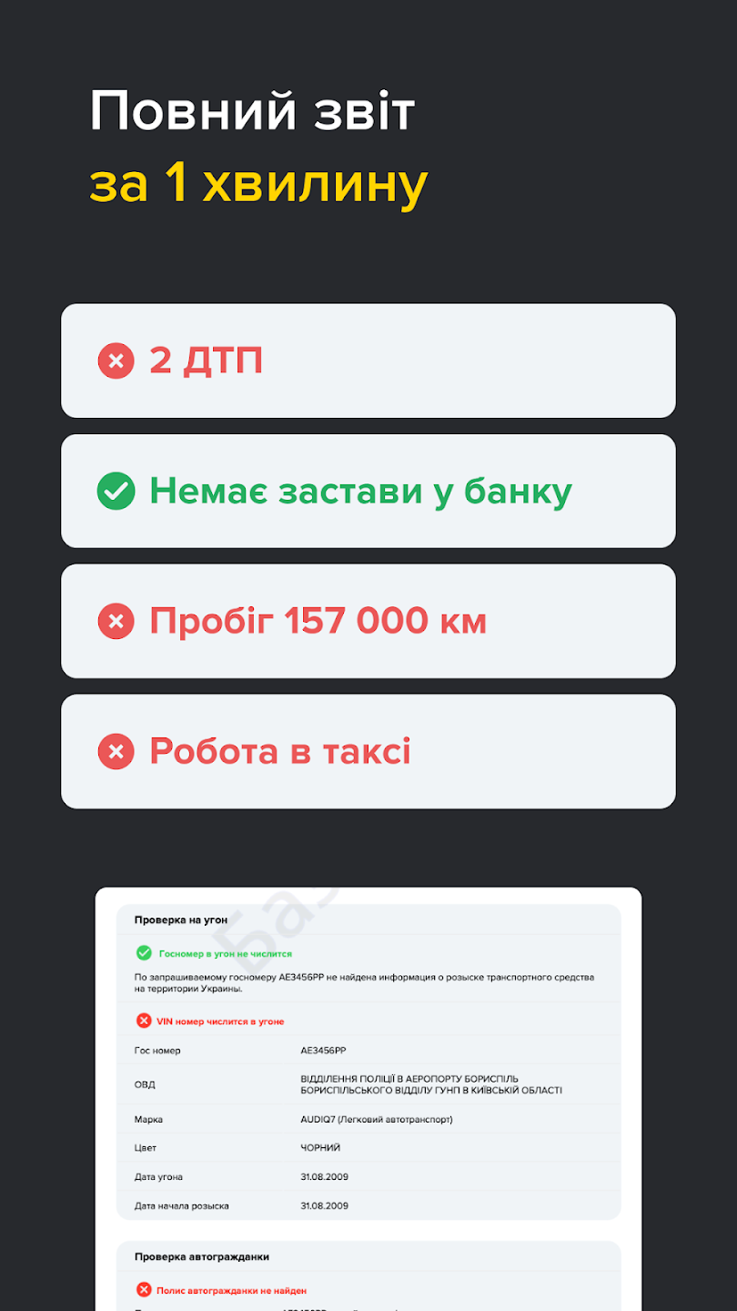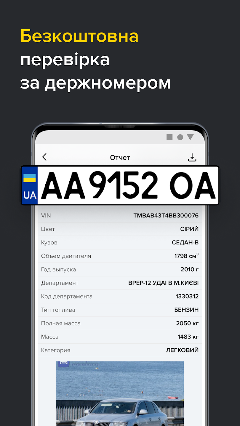 Купити або продати б/в авто тепер стане легше і безпечніше. Купуючи підписку, ви отримуєте необмежений доступ до кабінету водія до перевірок за додатковими джерелами. Також основну інформацію про авто можна отримати в додатку безкоштовно за держномером, техпаспортом або VIN. Унікальні бази автоскаут 24 та АЗС.