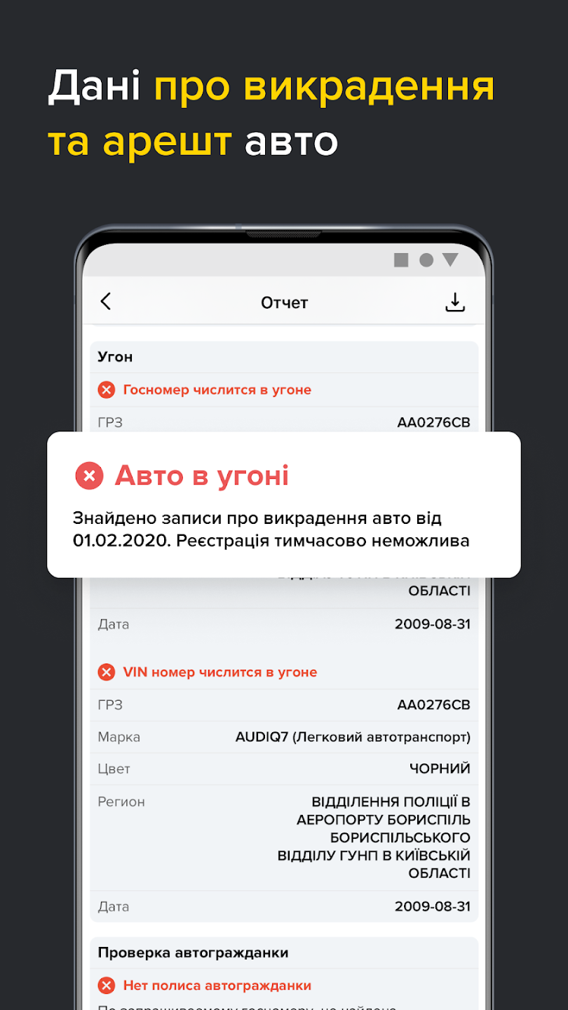 - додаток працює тільки для автомобілів зареєстрованих в Україні;