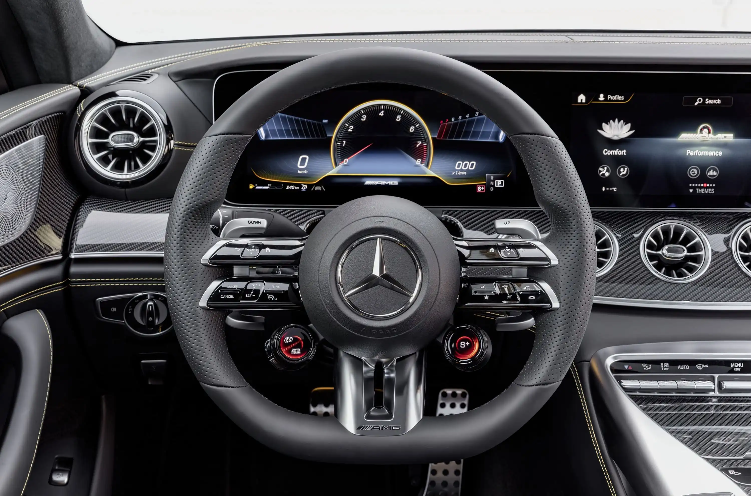 Технічних змін небагато. Ліфтбекам GT 63 переналаштували пневмопідвіску AMG Ride Control+, тому різниця між комфортним та спортивним режимами буде більш помітною. Крім того, за аналогією з шестициліндровими версіями, тут швидше за все стоять нові електроннокеровані амортизатори з двома клапанами обмеження тиску. Вони дозволяють незалежно регулювати параметри стиснення та відбою, завдяки чому демпфуюче зусилля змінюється швидше та у всьому діапазоні ходу коліс.