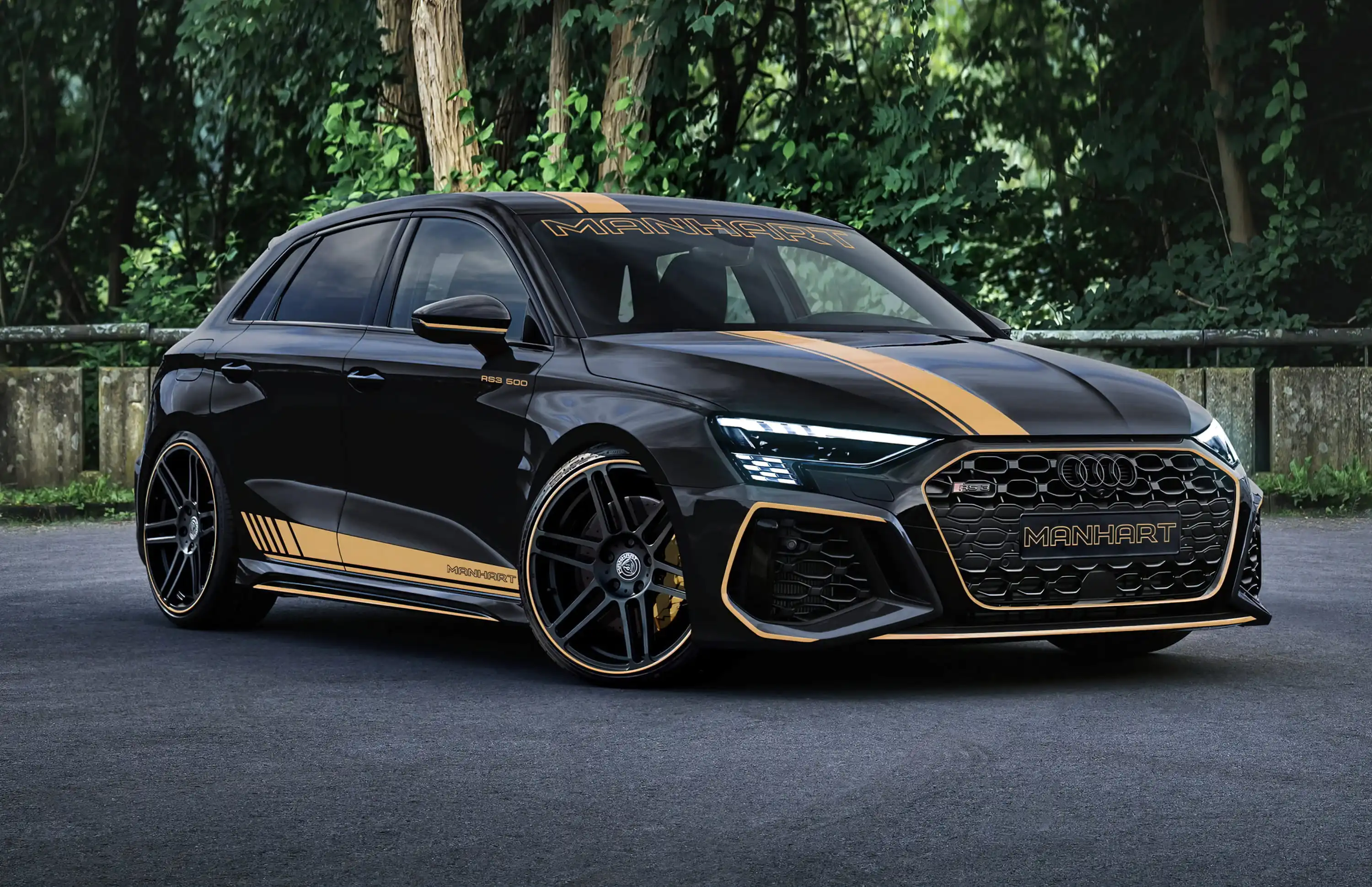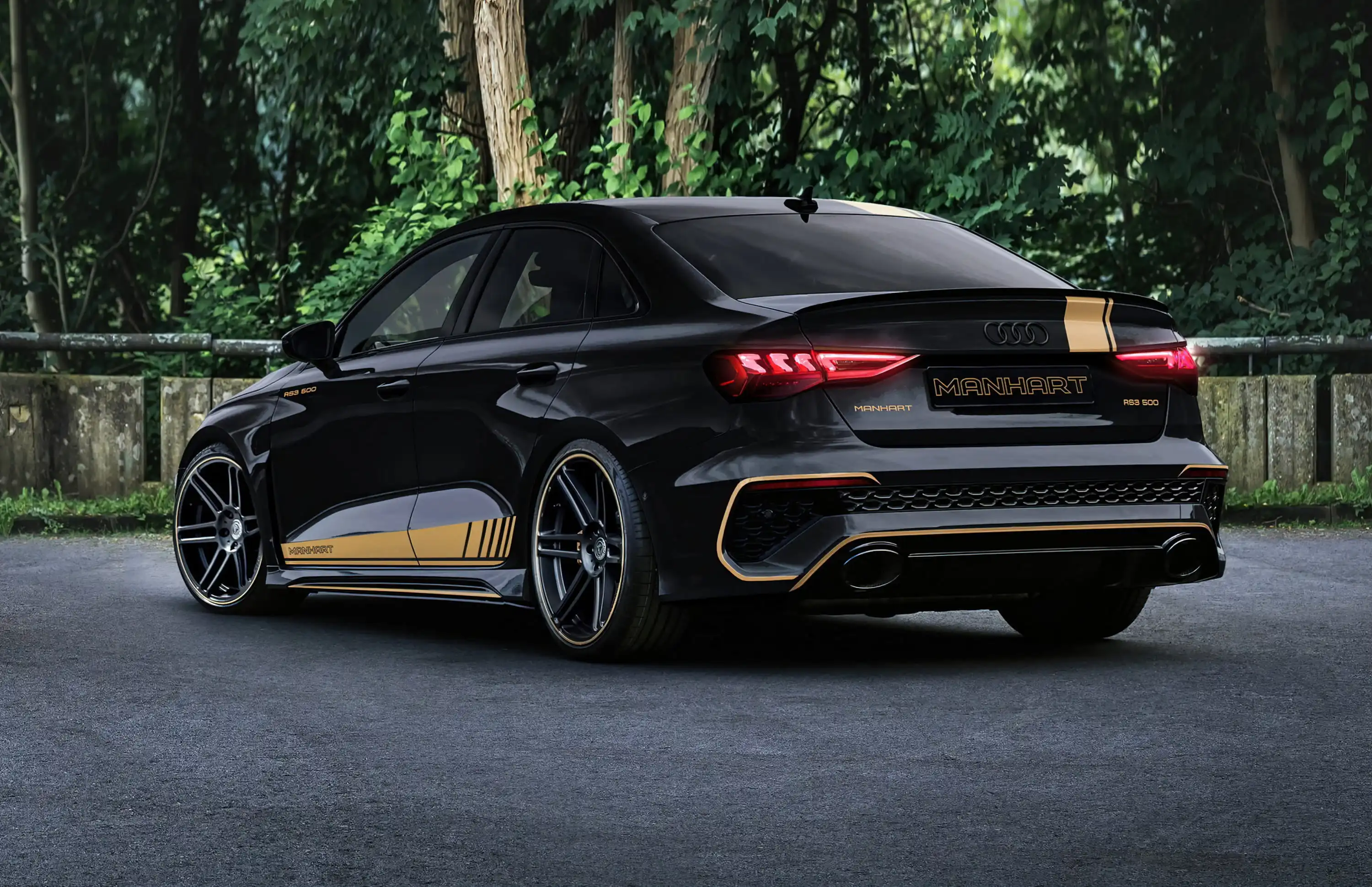 Готових автомобілів Manhart RS3 500 поки що немає, але на комп'ютерних рендерах можна оцінити масштаб доопрацювання екстер'єру — у тюнінг-ательє підготували нові бампера та накладки на колісні арки, а також традиційний для компанії набір золотистих наклейок для кузова. Передбачені й нові 20-дюймові колеса Concave One.