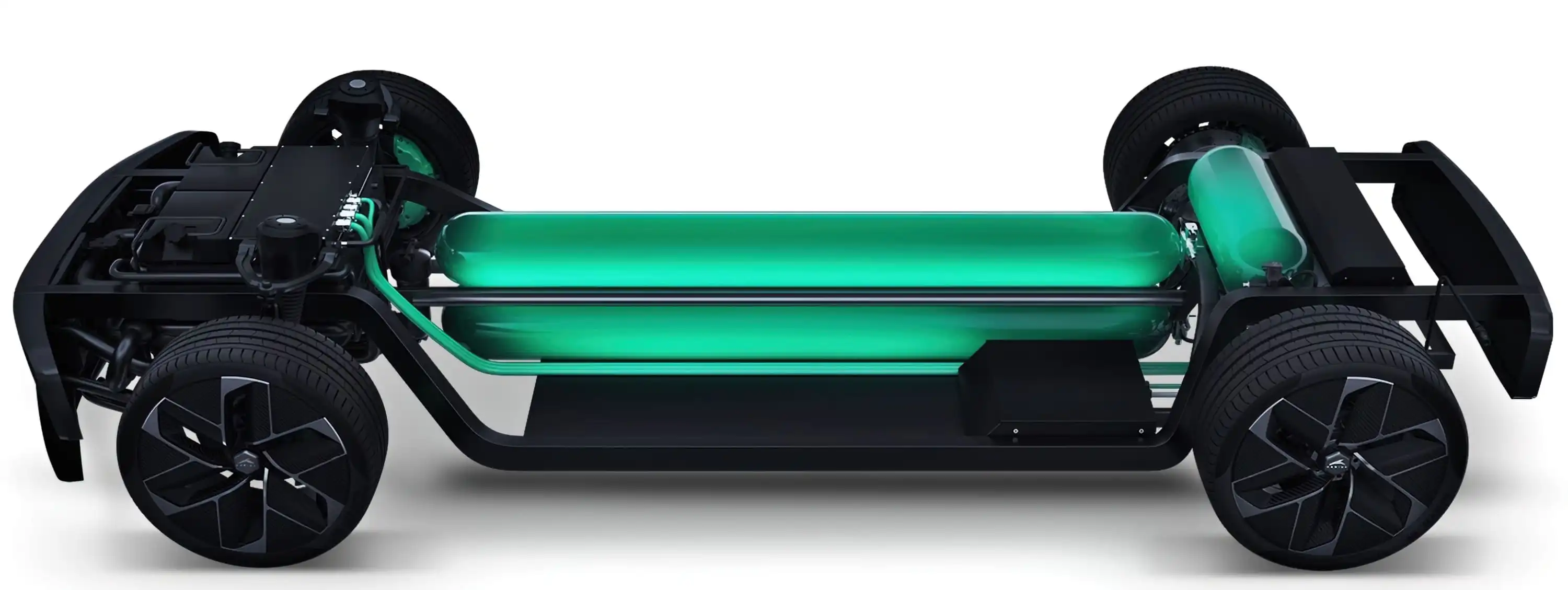 Другий маленький балон розташований поперечно над задньою віссю. Під задніми сидіннями знаходиться буферна акумуляторна батарея невеликої ємності. Електрохімічний генератор розташований перед капотом. Заявлена потужність силової установки – понад 500 к.с., максимальна швидкість – 230 км/год, дальність ходу на одній заправці – понад 1000 км, при цьому заправка баків воднем займає лише 3 хвилини. Передня підвіска, судячи з картинки, - на подвійних поперечних важелях, задня - багатоважільна, як пружні елементи використовуються пневмостійкі. Інші технічні деталі поки що засекречені.