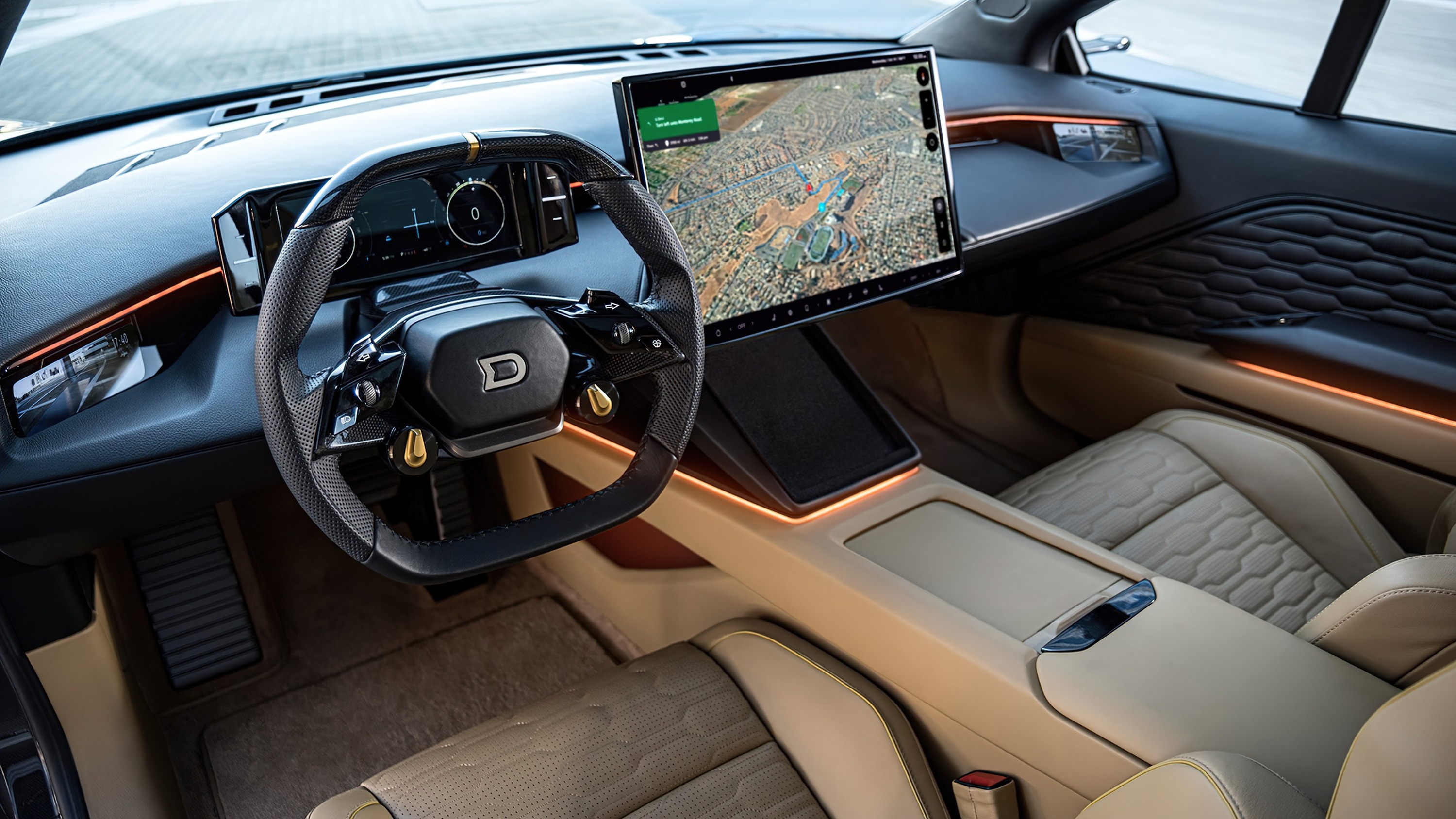 Салон - типовий для сучасних кросоверів, але оздоблення і деталі не справляють враження «гіпер-лакшері», скоріше звичайний преміум американського розливу, тобто не витончений. Лаконічна передня панель сконфігурована під установку бічних екранів, що замінюють зовнішні дзеркала, але компанія готова все ж таки запропонувати і звичайні дзеркала замість екранів (що буде в такому випадку на місці бічних екранів, незрозуміло). Центр передньої панелі займає 17,1-дюймовий мультимедійний сенсорний екран з операційною системою Drako DriveOS, куди «зашиті» всі ключові налаштування автомобіля, фізичних кнопок на передній панелі немає. Рамка мультимедійного екрану товста і глянсова, немов у недорого комп'ютерного монітора, а ось багатофункціональне кермо дуже витончене і нагадує такий у кросовера Lotus Eletre.