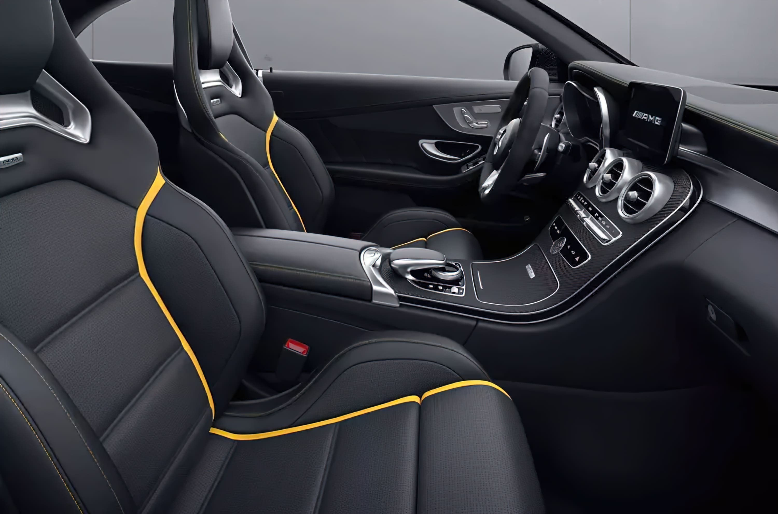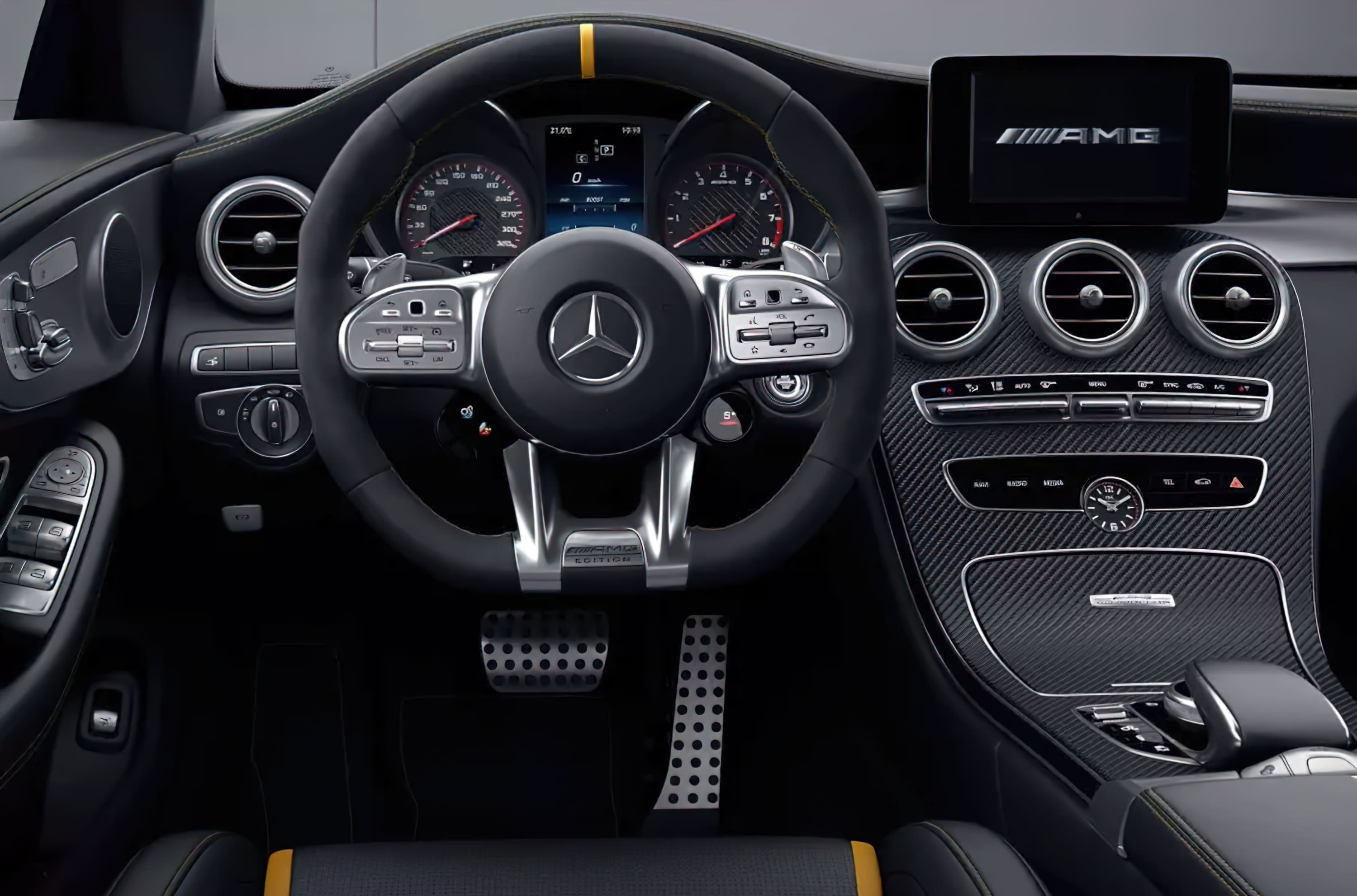 Кузов пофарбований у матовий відтінок Graphite Grey Magno, а також додані набір AMG Night Package та диски діаметром 20 дюймів. Чорна шкіра в інтер'єрі поєднується з контрастним жовтим рядком, декор вуглепластиковий.