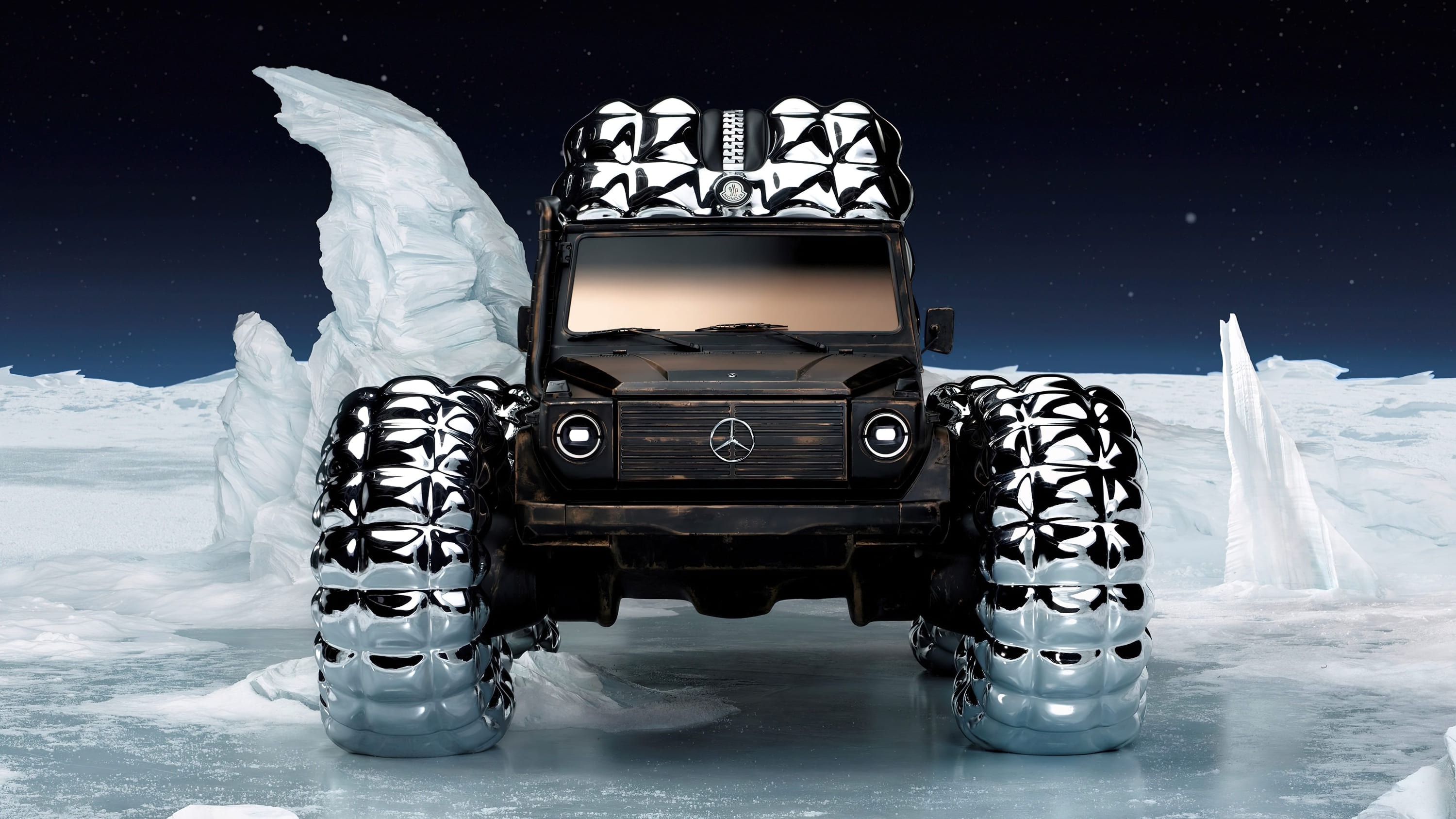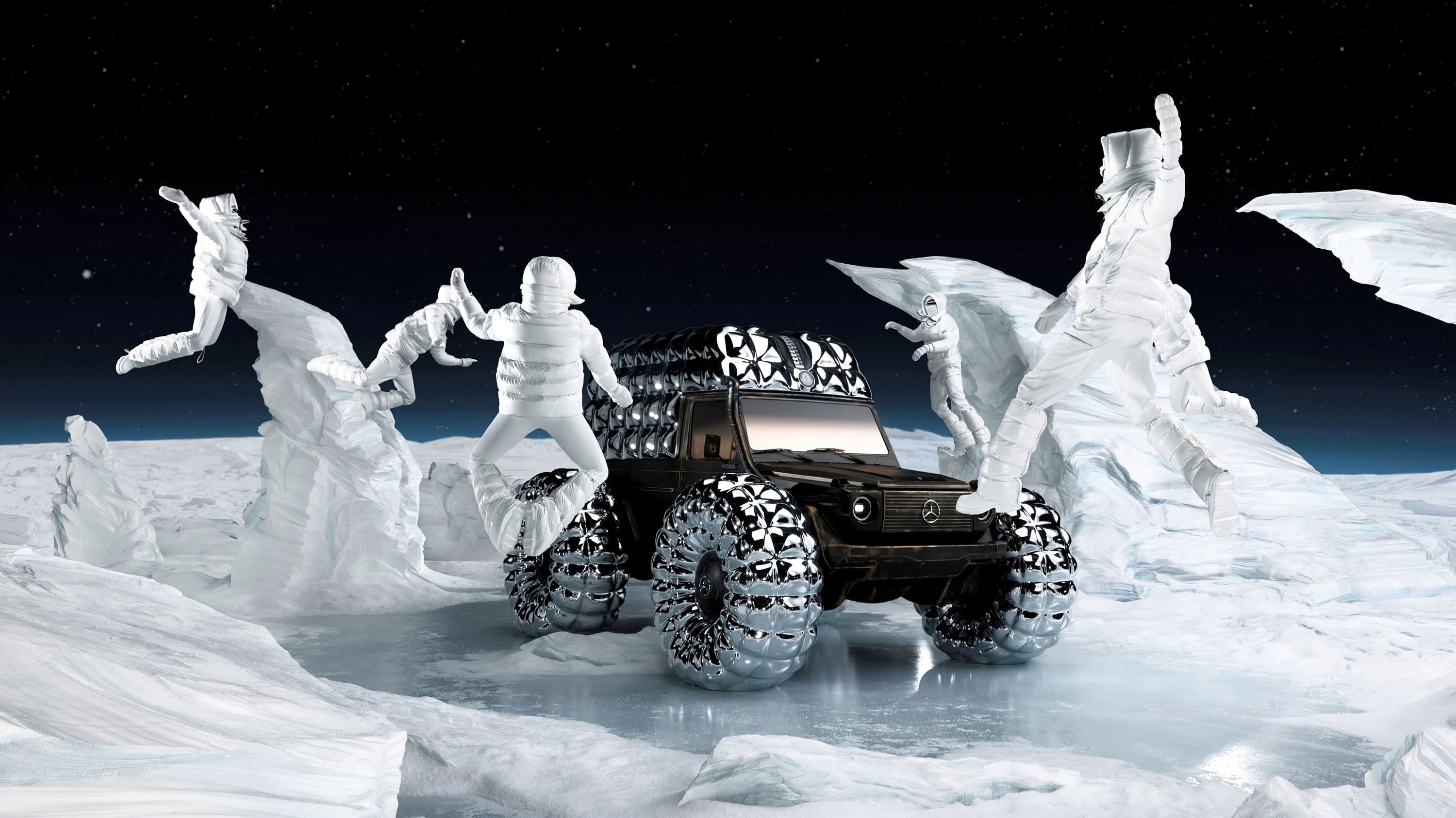 Корпус позашляховика виготовлений з модельного пластиліну, він повторює форму Mercedes-Benz G-класу ранніх років випуску, причому зовнішні поверхні покриті штучною патиною. Автомобіль виконаний у форматі пікапа з однорядною кабіною, а кузов накритий кунгом із блискучої стьобаної тканини, типової для пуховиків Moncler. З цього ж матеріалу виготовлені накладки на пороги та гігантські колеса, які не помістилися в колісні арки. Верх кунга прикрашає гігантська блискавка, що опускається до корми та увінчана фірмовим медальйоном Moncler.