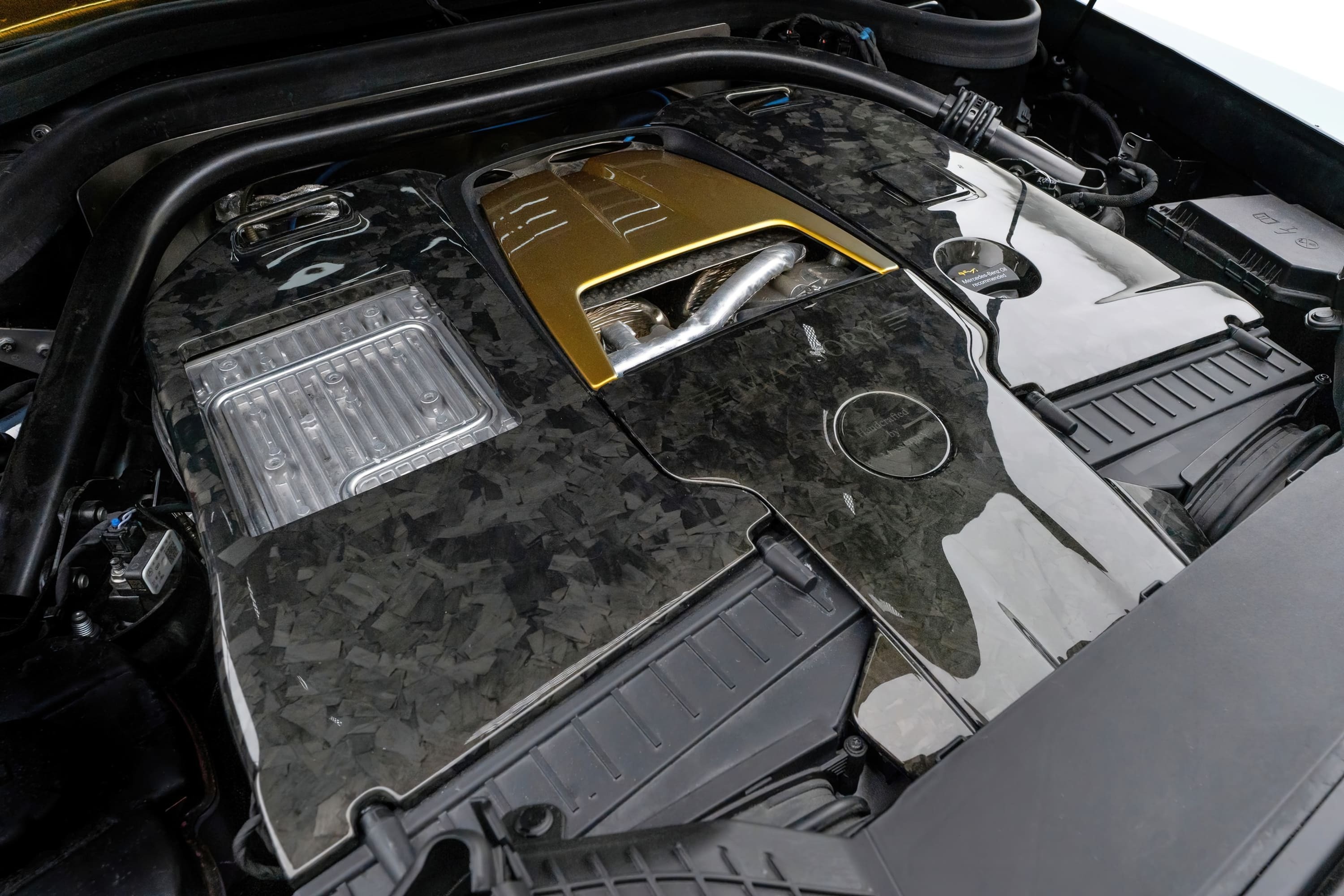 4,0-літровий бензиновий бітурбомотор V8 (заводський індекс М177) під капотом Gronos Coupe EVO C форсований з 585 к.с. та 850 Нм до 900 к.с. і 1200 Нм, час розгону з місця до 100 км/год скоротився з 4,5 до 3,3 с - це навіть крутіше, ніж у Brabus 900 Rocket Edition, який набирає першу сотню за 3,7 с. Вуглепластиковий обвіс у геліка від Mansory не менш агресивний, ніж у Брабуса, на купе він підкреслений незвичайним основним кольором кузова - градієнтним Fludium з ефектом хрому і перламутру. Крім того, на тридверці дебютували нові 24-дюймові колісні диски FD.15, пофарбовані у колір кузова.