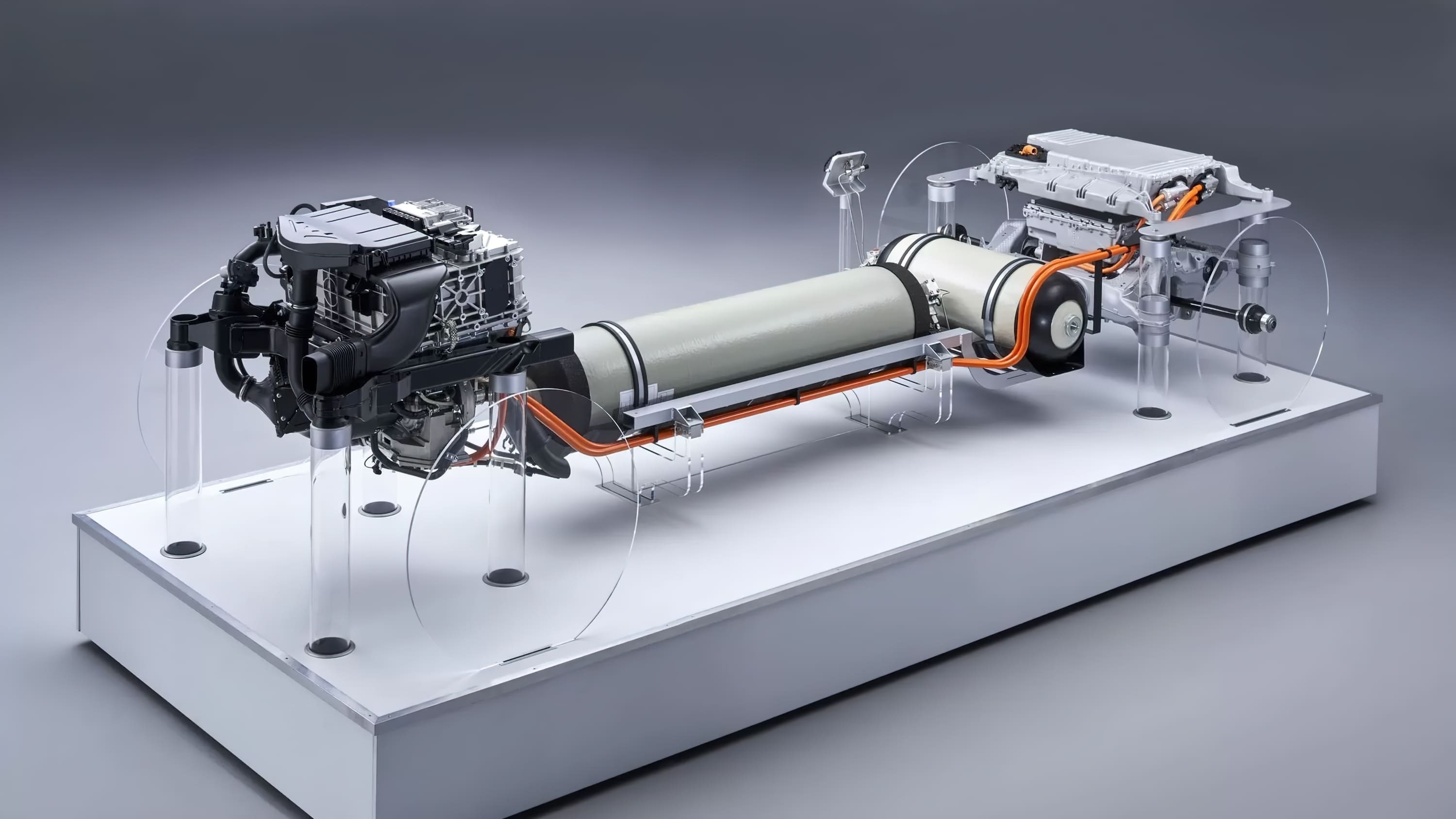 Водень загальною масою близько 6 кг зберігається під тиском 700 бар у двох вуглепластикових балонах, розташованих Т-подібно в межах колісної бази, їхня повна заправка займає всього 3-4 хвилини. Електрохімічний генератор спереду під капотом, його постійна потужність - 125 кВт (170 к.с.). Єдиний електромотор разом із редуктором, блоком керування, силовою електронікою та буферною літій-іонною батареєю розташований на задній вісі. Максимальна віддача електромотора - 295 кВт (401 к.с.), тоді як на стадії прототипу заявлялося 275 кВт (374 к.с.). Електричний силовий блок скомпонований дуже компактно та не впливає на об'єм багажника.